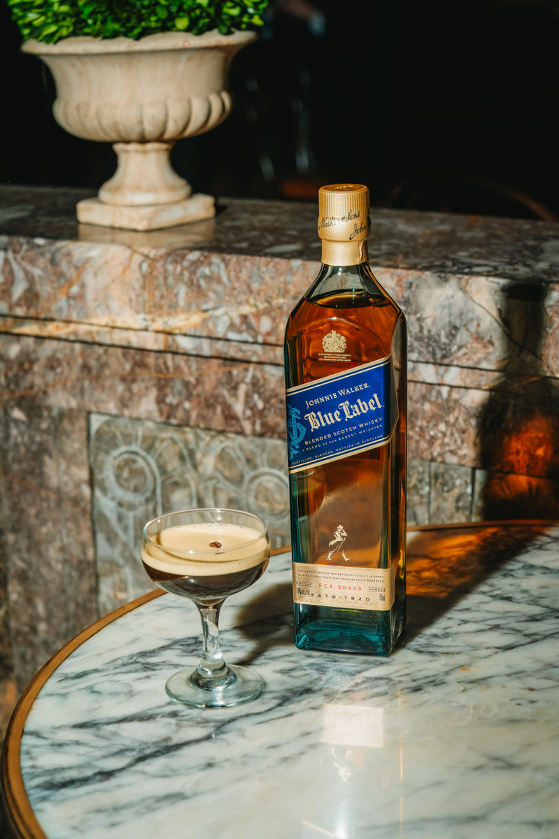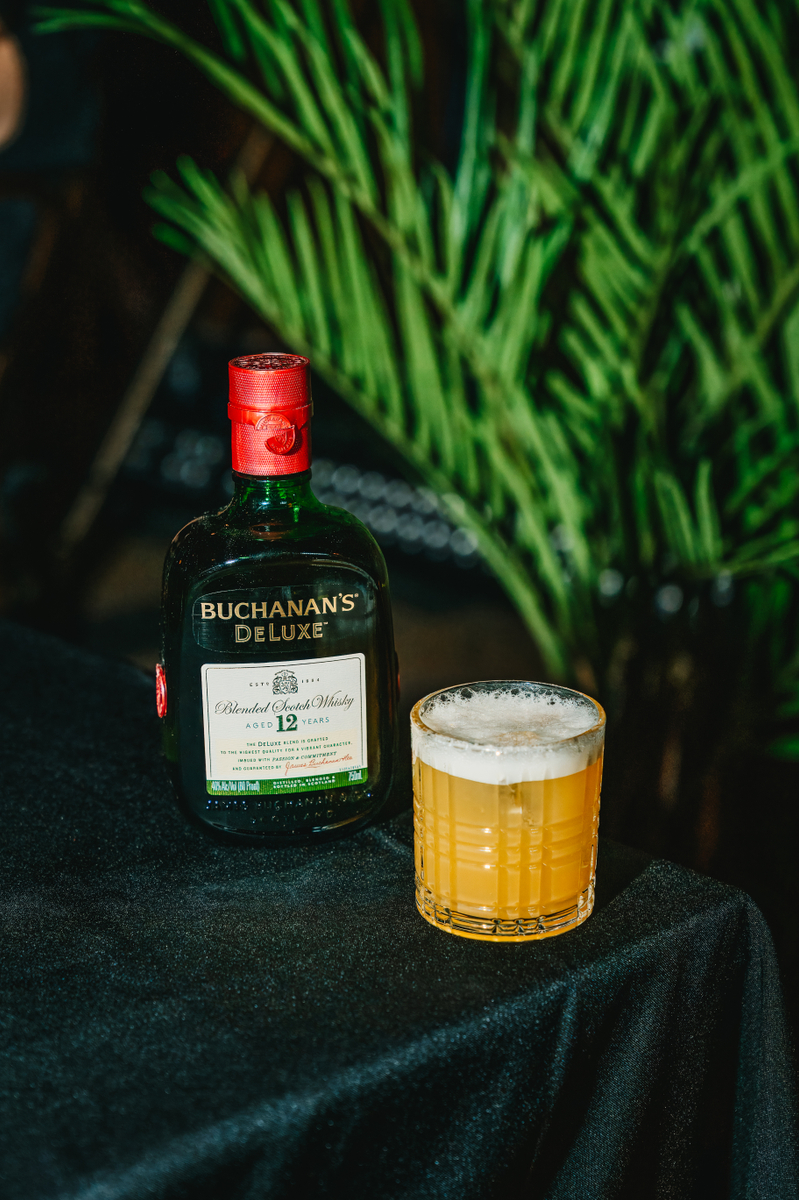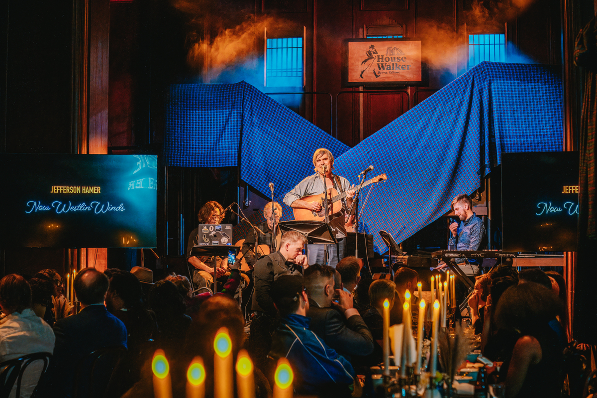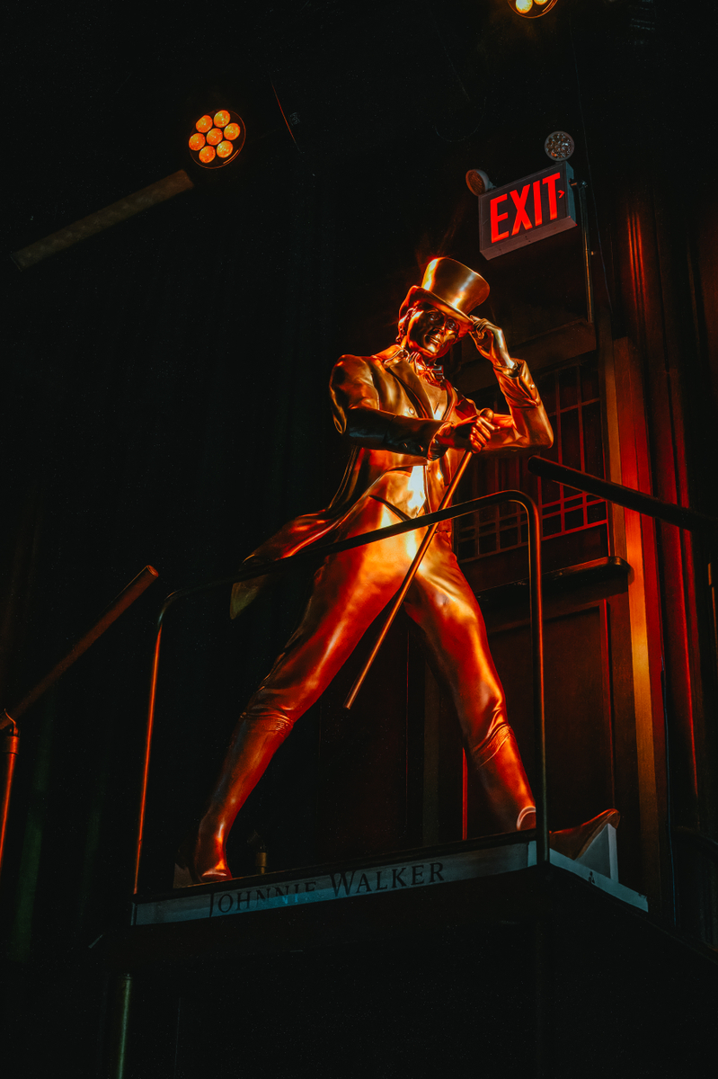 The night began in the grand former bank teller area, where cocktails from across the portfolio flowed —everything from Paper Planes to Espresso Martinis. A Scottish band played, complete with bagpipes, as guests mingled and explored. One standout touch was the interactive photo booth, which turned photos into sepia-toned prints featuring Robert Burns himself. At one point, Andrew Weir made an announcement and led us through a series of rooms filled with brand surprises, including a green-lit Buchanan’s room and another where “Johnnie Walker” himself sat behind a desk for photos. The journey ended in a striking industrial-style room with long communal tables, candelabras, a stage, a bar, and the iconic Johnnie Walker statue—an unforgettable setting for the evening’s performances.