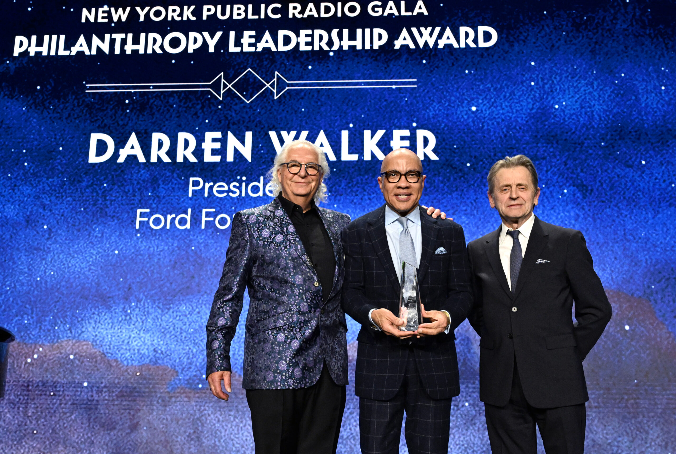 NEW YORK, NEW YORK – NOVEMBER 18: (L-R) John Rose, Darren Walker and Mikhail Baryshnikov appear onstage during the New York Public Radio Gala at the Glasshouse on November 18, 2025 in New York City. (Photo by Slaven Vlasic/Getty Images)