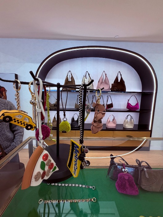 Bag charms are dotted throughout the room, showing up as small accents across different styles. Some lean playful, like furry animals, while others are more tied to New York, with mini pizza slices and yellow taxi cabs. The MetroCard charm also makes an appearance, coming back as part of a limited-edition restock after selling out last year. With MetroCards being phased out, it becomes a playful way to hold onto a piece of the city, turning something once swiped daily into more of a keepsake.