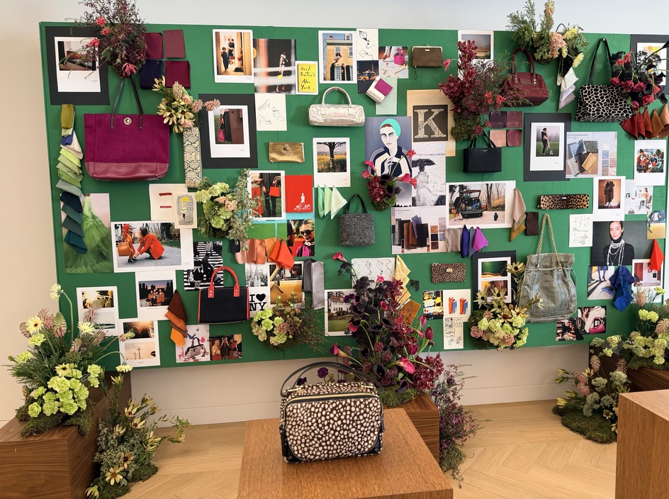 A vibrant jade green backdrop sets the tone, layered with bags, swatches, and imagery, making it hard to know where to look. The first thing that caught my attention was a magenta tote on the far left, a color that continues to show up throughout the showroom, almost hinting at what’s ahead for fall.