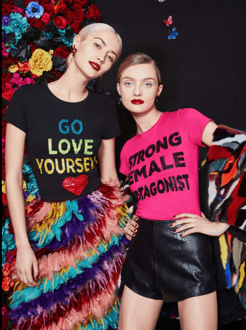 The collection was divided into eight sections: Butterfly Kingdom, Butterfly Fantasia, Virtuous Vines, Golden Leaf, Grateful, Kaleidoscope, Rose Room, and Snow Palace– each with their own displays and stories. The blends of butterfly patterns with leopard and zebra prints brought a whimsical take on Bendet’s classic playfulness, and cheekily rainbow-colored tops embroidered with “Go Love Yourself” and “Strong Female Protagonist,” along with a fringe sweatshirt emblazoned with “Grateful,” added a technicolored fun to the show.