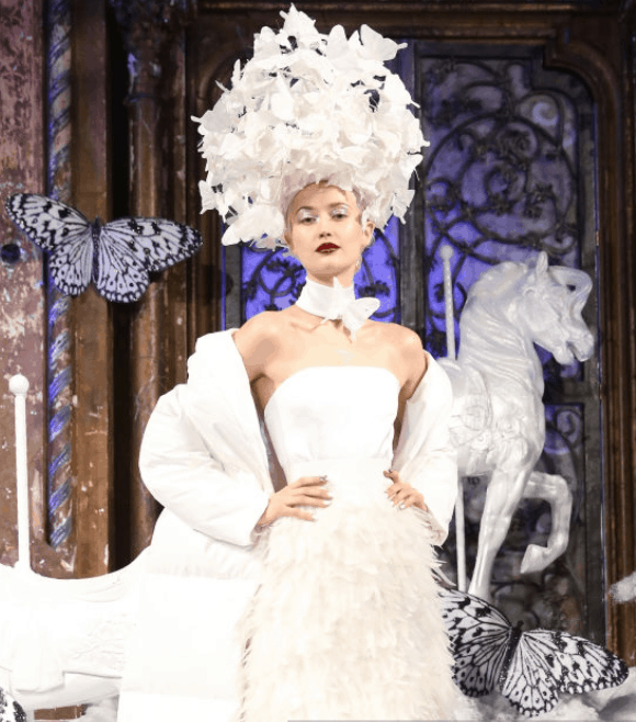 The ultimate winter ensemble, however, was the opening look for the Snow Palace section, aptly titled “Snow Queen.” The all-white outfit paired a satin bustier top with a cascading feather skirt, topped with a shiny puffer coat and massively grand ivory butterfly headpiece, marrying functionality with red carpet regality.
