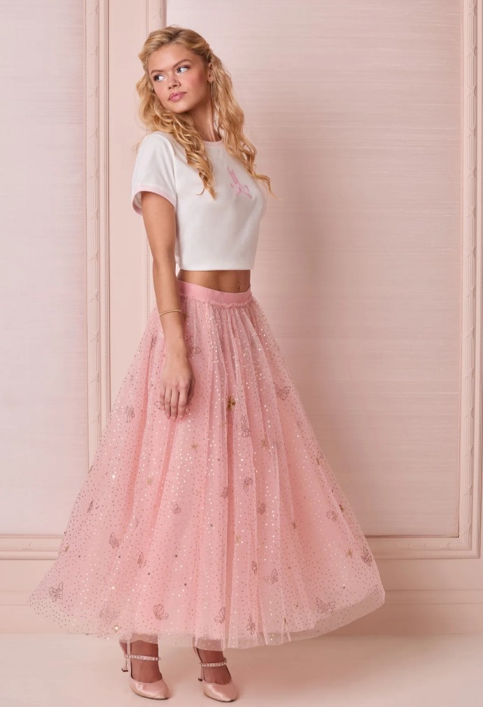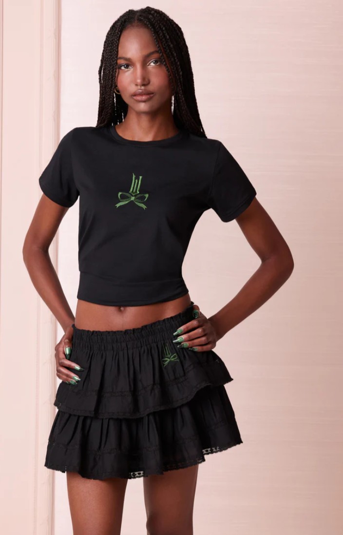 The Wicked x LoveShackFancy collection brings the theatrical magic of the film to everyday fashion. LoveShackFancy, the global fashion, beauty, home, and lifestyle brand founded by Rebecca Hessel, captures the thrilling beauty of Wicked’s iconic costumes in its designs. The collection features standout pieces including the Lia Tee, , Palo Pullover, and the Ruffle Mini Skirt each blending the brand’s whimsical, romantic aesthetic with a playful nod to the beloved characters. Red carpet worthy is the magnanimous Wilona Skirt — pink, sparkly and everything Glinda would love. Inspired by the film’s unforgettable style, these pieces celebrate color, texture, and the enchantment of storytelling through fashion. The Wicked x LoveShackFancy Mini Octavia Pouch brings a touch of floral magic to your glam routine. Embroidered with the Wicked logo and dreamy blooms, this soft, compact bag is perfect for stashing your essentials—proof that even your makeup pouch can be totally spellbinding.