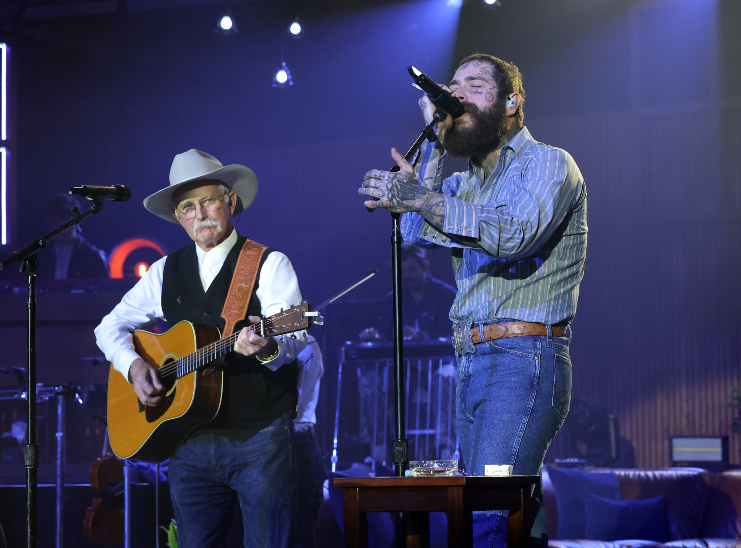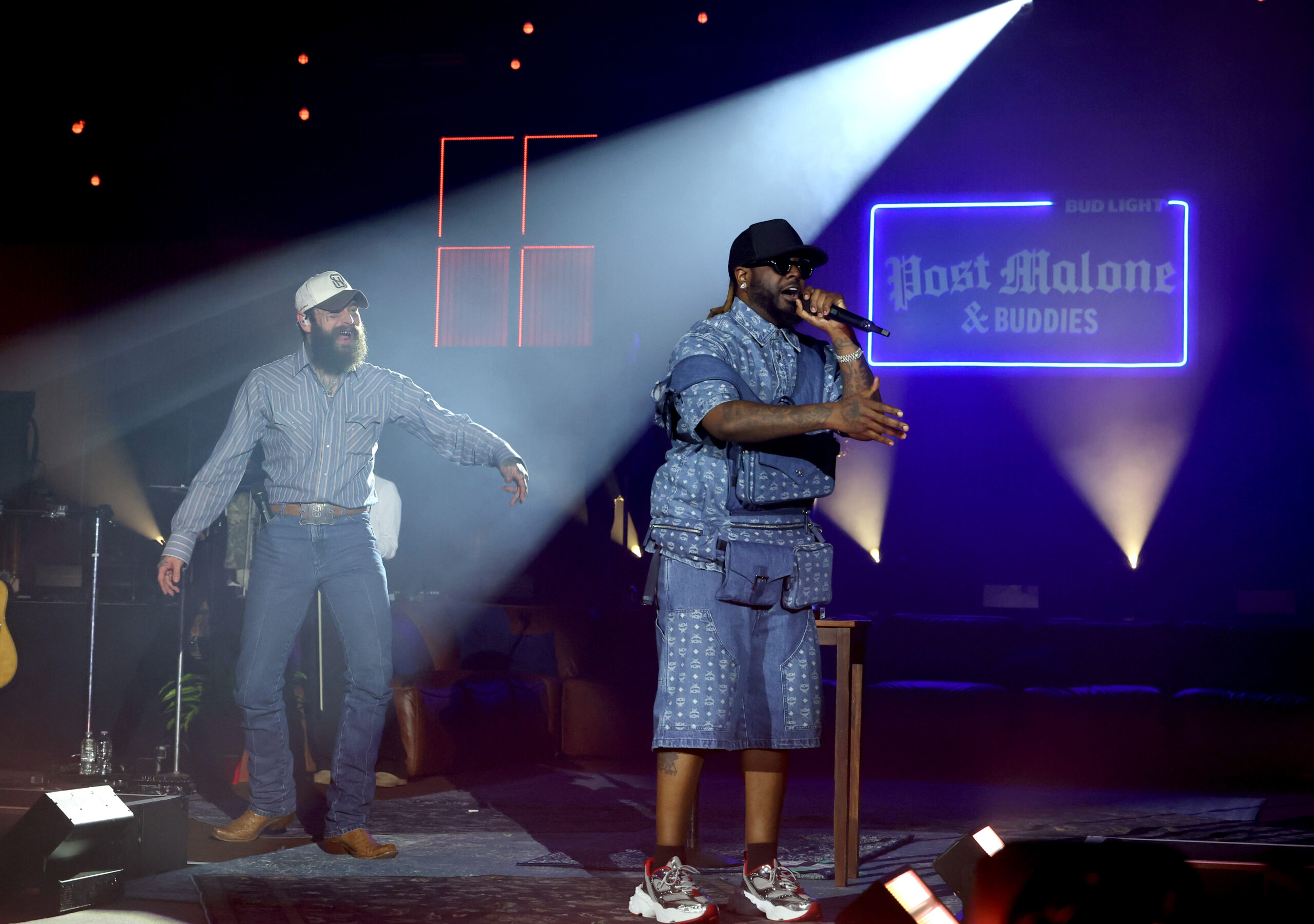 SAN FRANCISCO, CALIFORNIA – FEBRUARY 06: (L-R) Dave Stamey and Post Malone perform onstage during 9x RIAA diamond-certified, GRAMMY® Award-nominated superstar Post Malone rocks out at the one-night only Bud Light Presents Post Malone & Buddies show to kick off Super Bowl LX weekend at Fort Mason Center on February 06, 2026 in San Francisco, California. (Photo by Kevin Mazur/Getty Images for Bud Light)