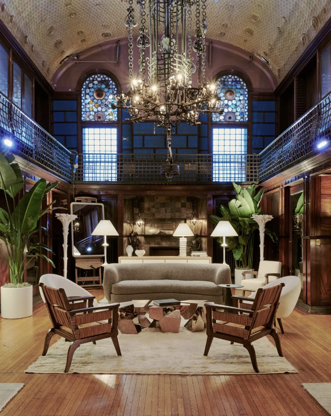 The lounge responds directly to the architecture of the Armory’s Veterans Room, originally realized under the artistic direction of Louis C. Tiffany. Instead of competing with the room’s historic presence, frenchCALIFORNIA works in dialogue with it. Modern silhouettes and restrained palettes sit comfortably against the building’s ornate bones, creating a quiet tension between past and present. Seating arrangements are intentionally relaxed, encouraging conversation without formality and reinforcing the salon’s role as a place for exchange rather than display.