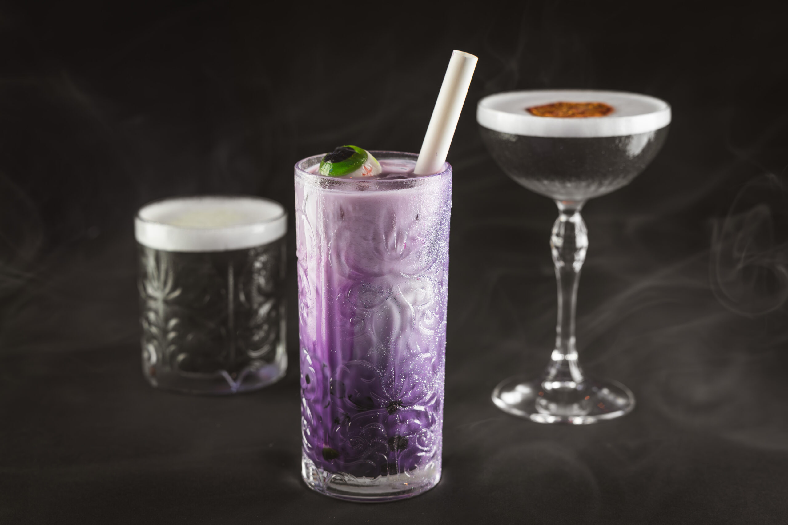 Delicious drinks at the Haunted Mansion Parlor include selections of ghostly cocktails that capture the spirit of the ride including blood orange and sour cherry flavors that harmonize in a shimmering zero proof cocktail served in a specialty mug aptly titled, Sympathetic Libations; The Ghoulish Delight with an ube-flavored treat that everyone will be able to enjoy; and an increible spooky twist on a classic margarita, presented to guests amidst a swirl of flavored smoke made with lemon salt foam and tequila that will reveal a secret message, only to be revealed by black light.