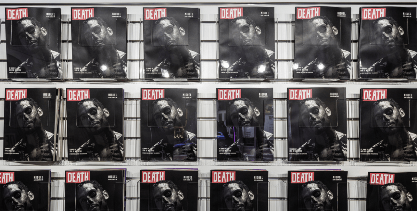 The celebration took place in Soho, at an exhibit turned speakeasy with a newsstand in a front and a party in the back. The provocative question “Did You Die Today?” displayed in front of the event drew a fair share of attention, and stepping into the small storefront filled with rows of DEATH magazines and one black curtain only added to the intrigue.