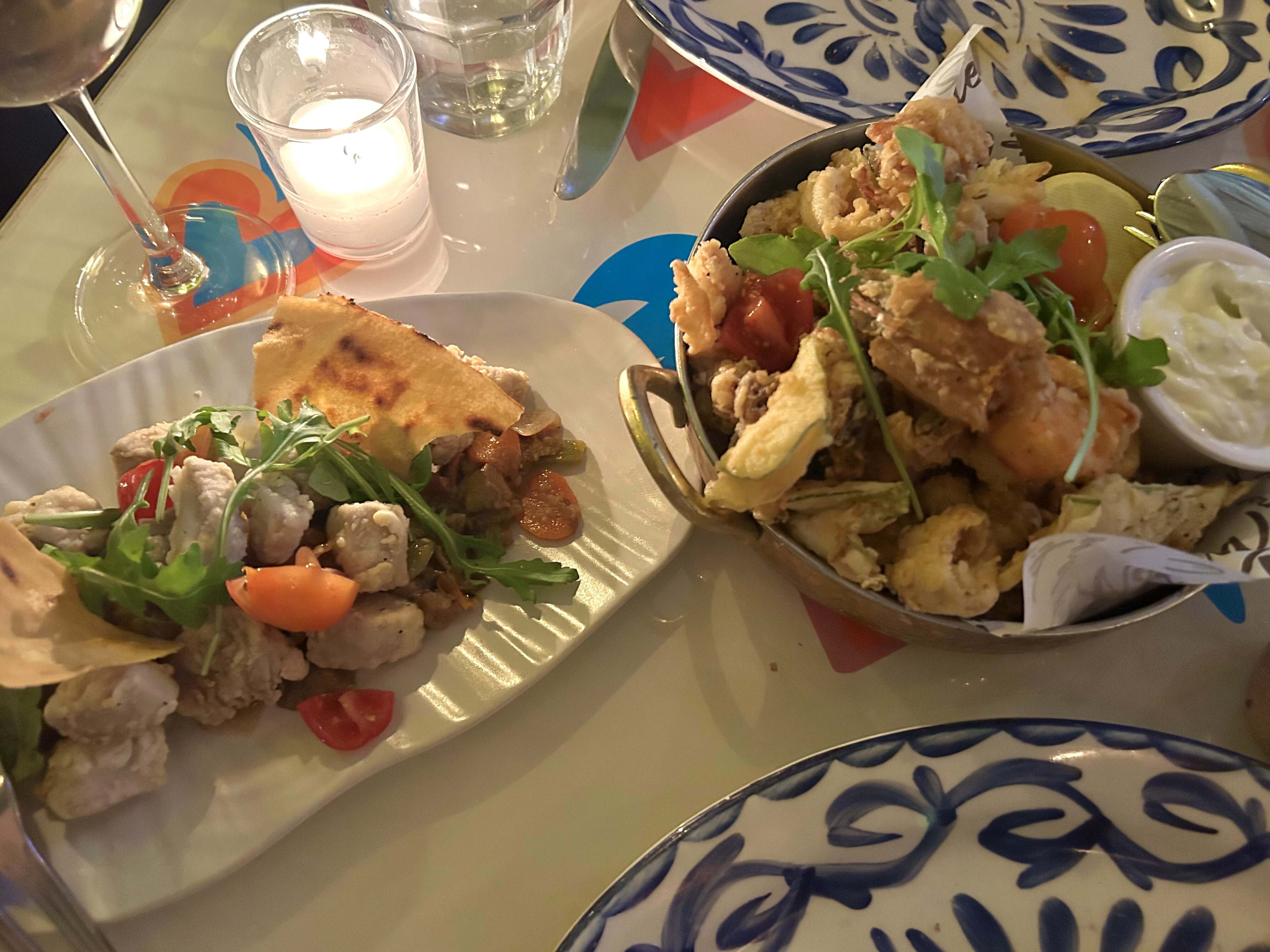 Frittura di Calamari, Gamberetti e Zucchine: lightly fried calamari, shrimp, & zucchini