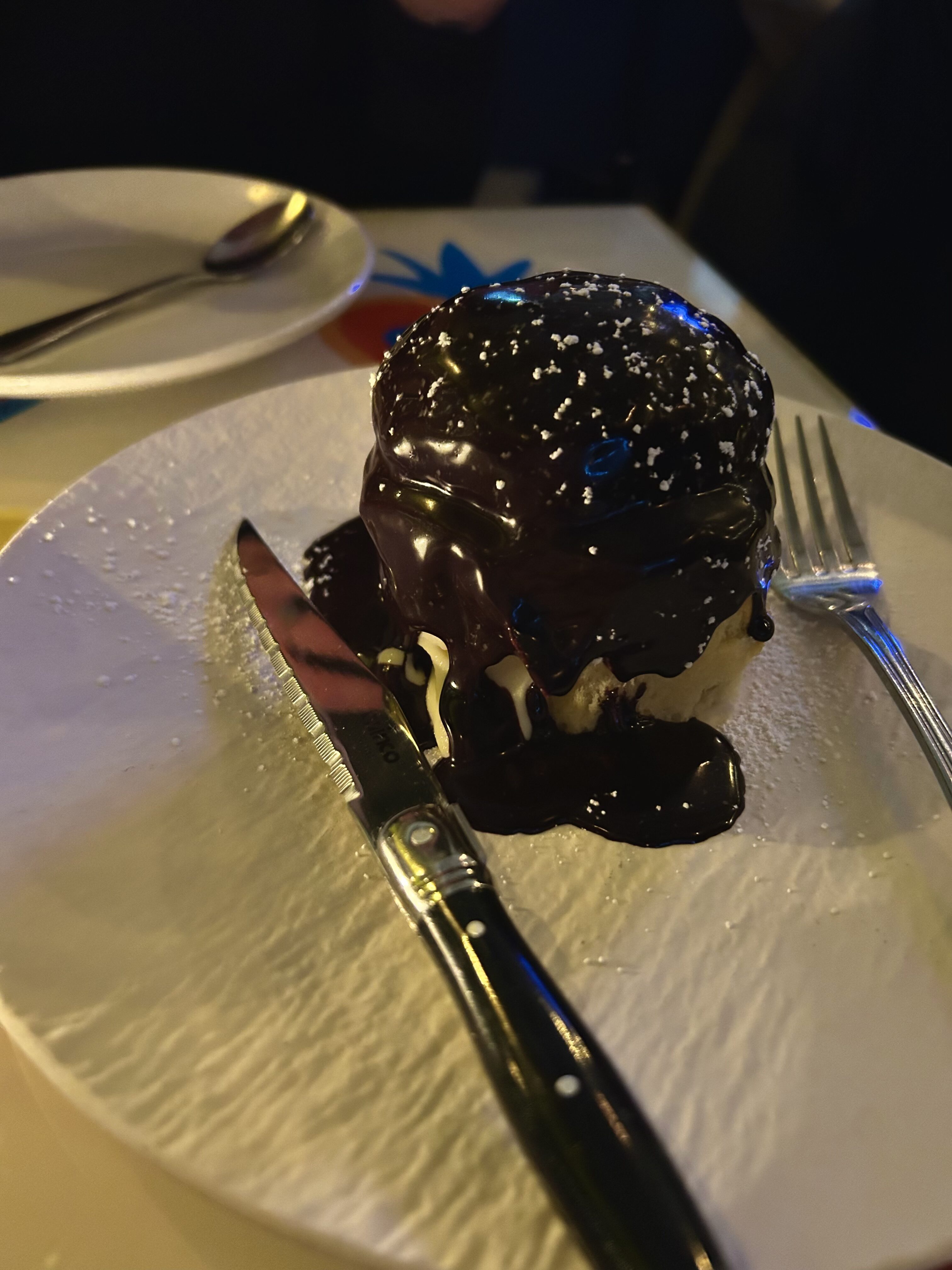 Sicily’s quintessential Christmas dessert: a large ring-shaped cake filled with sundried dates and nuts. The tableside presentation was delightful, and the generous drizzle of chocolate sauce was much appreciated.