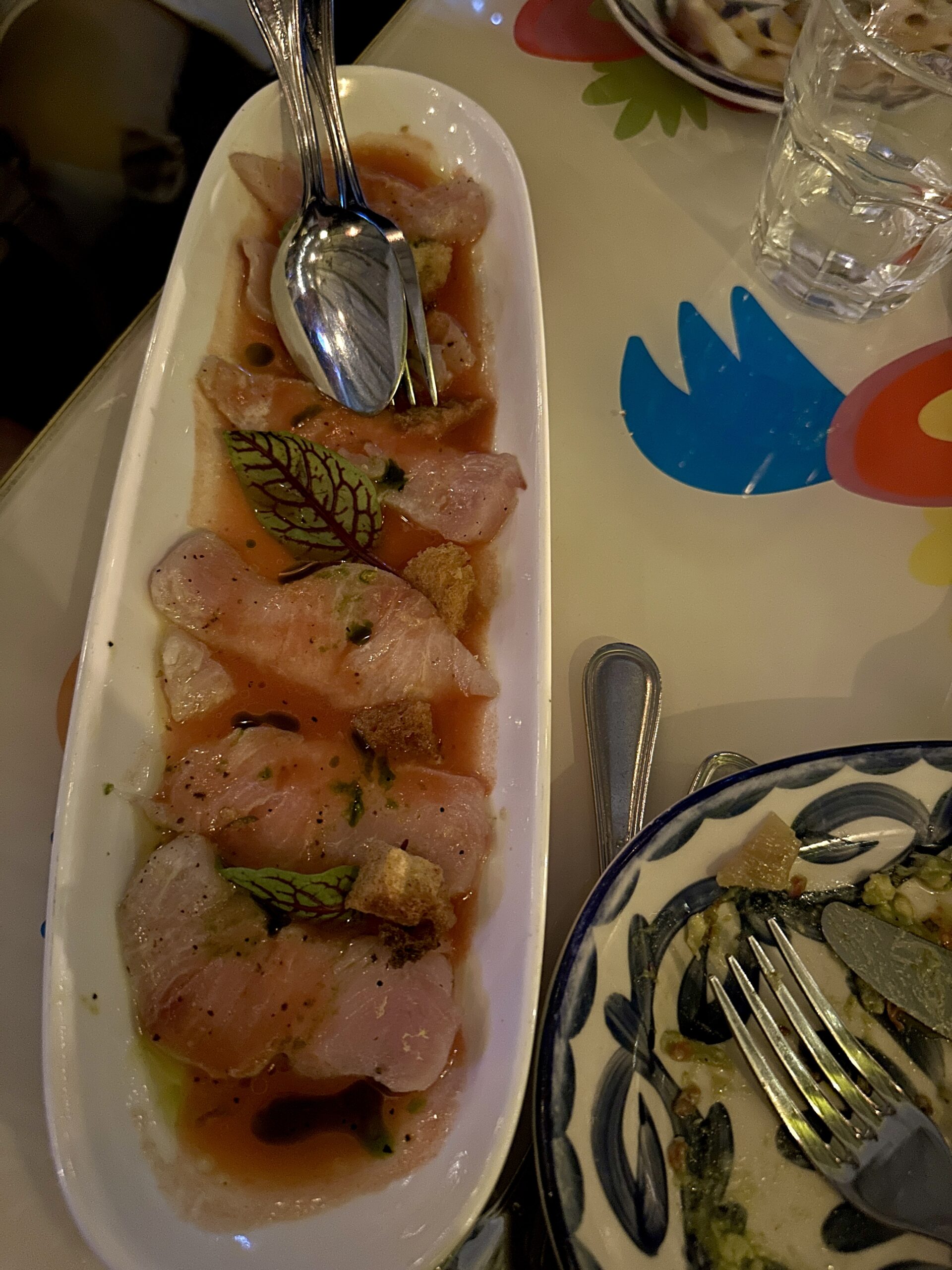 Carpaccio di Ricciola Marinato in Acqua i Pomodoro e Agrumi: yellowtail carpaccio marinated in tomato water and citrus
