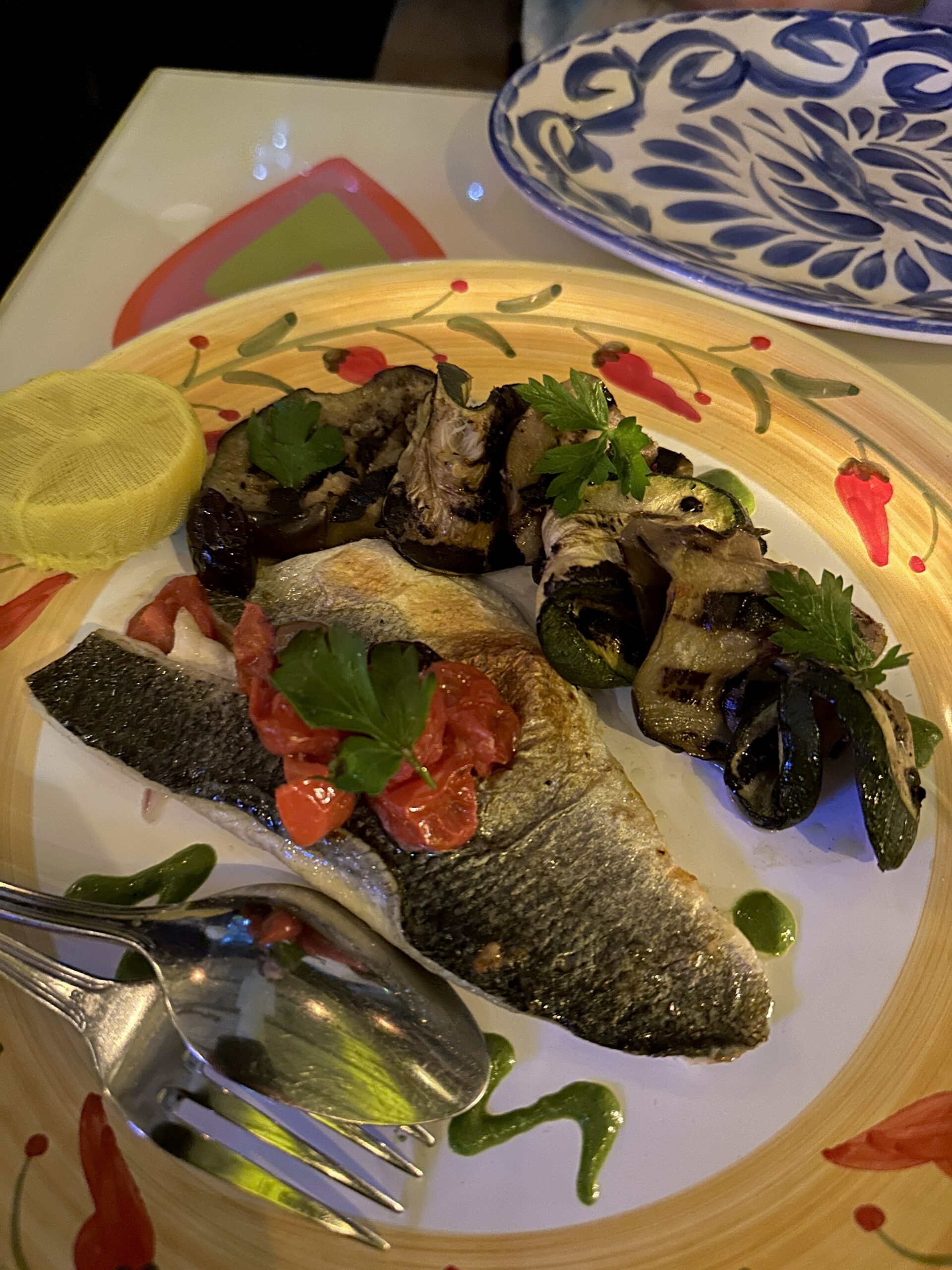 Filetto di Branzino: Sea bass with grilled vegetables