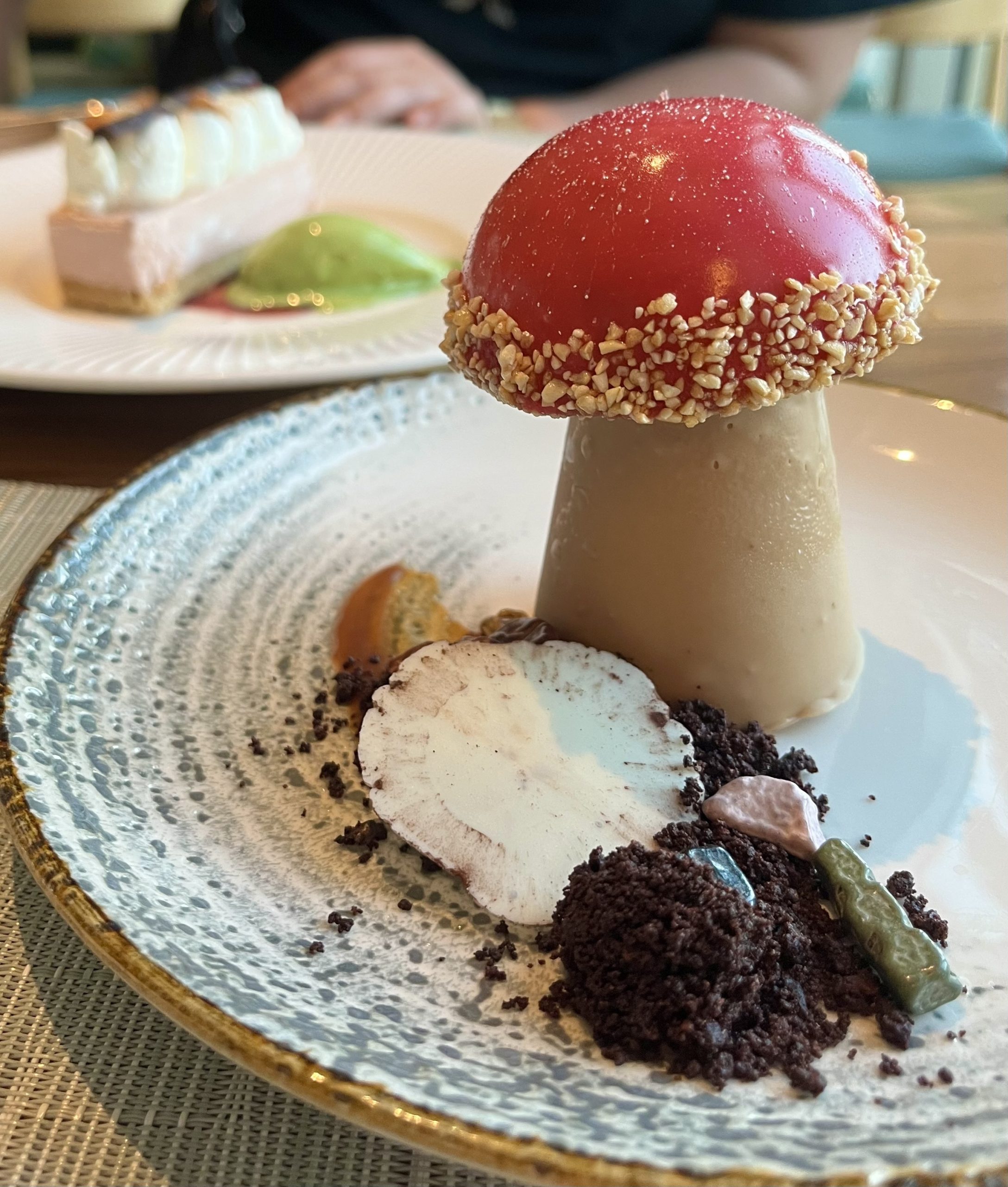 In addition, the Caramelia showstopper is shaped like a mushroom and chock full of decadent flavors. A cross section cut reveals chocolate mouse and espresso caramel fill the inside of the mushroom. Cocoa soil and edible chocolate rocks sit next to its base. This alludes to the idea that this mushroom was living in a real garden, or perhaps serving a fairy’s home.