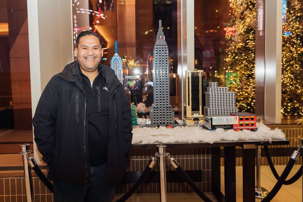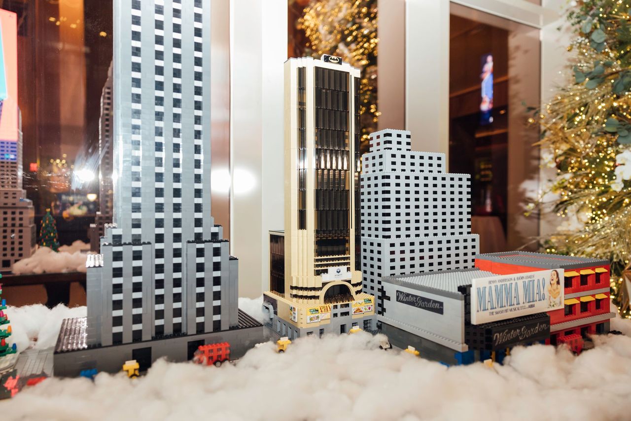 To mark December twELF, the hotel paid homage to the beloved holiday film Elf with a stunning recreation of Buddy the Elf’s iconic NYC skyline display from the Gimbels department store scene. Created by artist Sid Dinsay using more than 30,000 bricks, the installation rose nearly six feet tall and featured detailed recreations of the Chrysler Building, Empire State Building, and MetLife Tower—alongside custom brick versions of the Hyatt Regency Times Square itself and the nearby Winter Garden Theatre, created especially for the hotel’s very first holiday season.