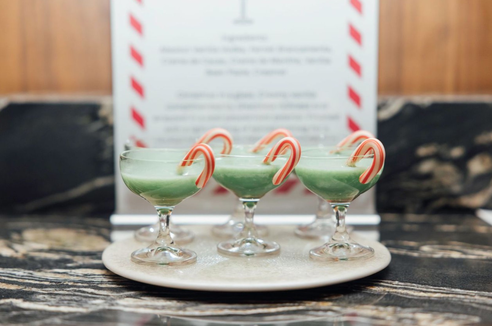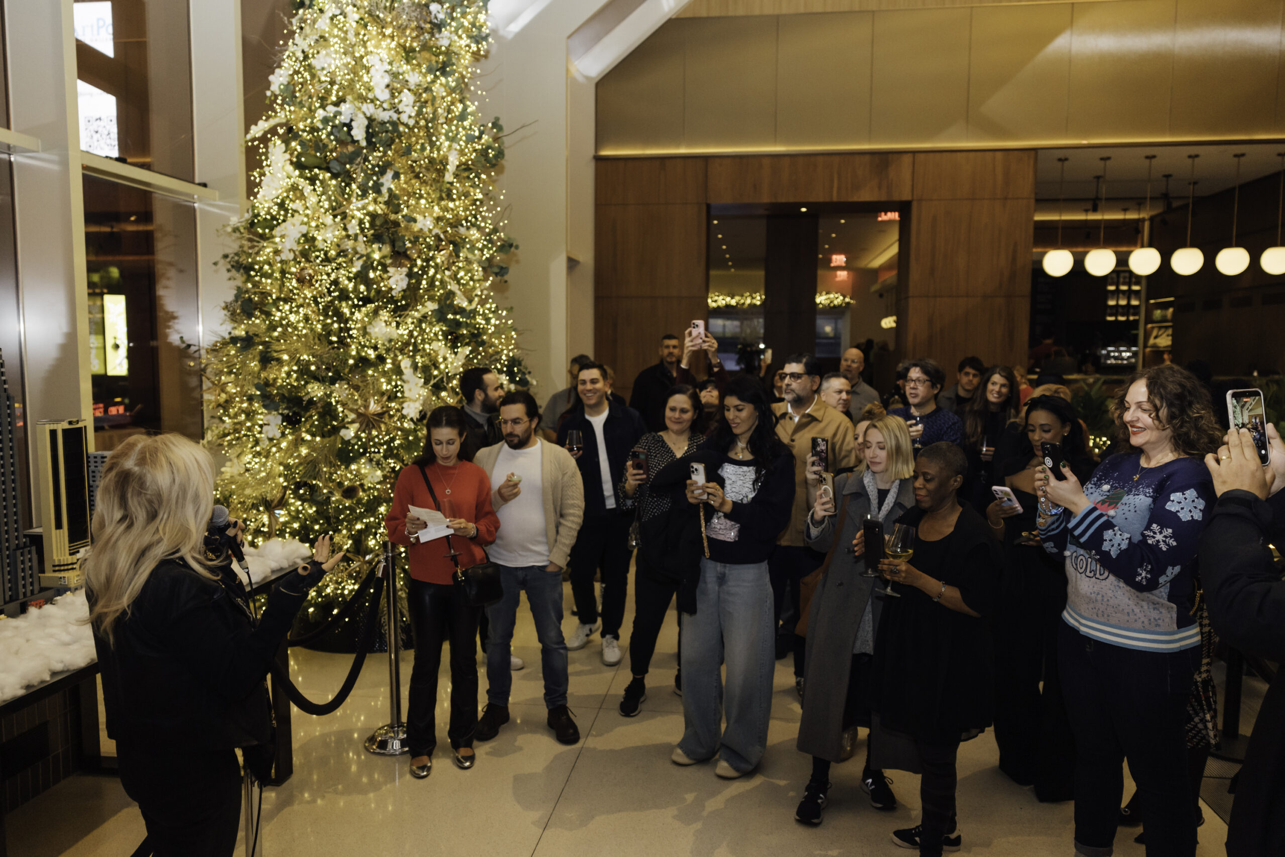 The display debuted beside a striking 25-foot-tall Christmas tree in the hotel’s soaring lobby as guests enjoyed a preview of Cue 48, the property’s upcoming signature restaurant overlooking Times Square, set to open on Wednesday, January 7, 2026. Designed as a modern, social dining destination, Cue 48 is where elevated American dishes and hand-crafted cocktails meet a warm, theatrical vibe—shifting effortlessly from bright, welcoming breakfasts to spirited nightcaps near the glow of Times Square. Passed bites for the evening included empanadas and flatbreads, paired with the hotel’s signature holiday cocktail, the Peppermint-Tini.