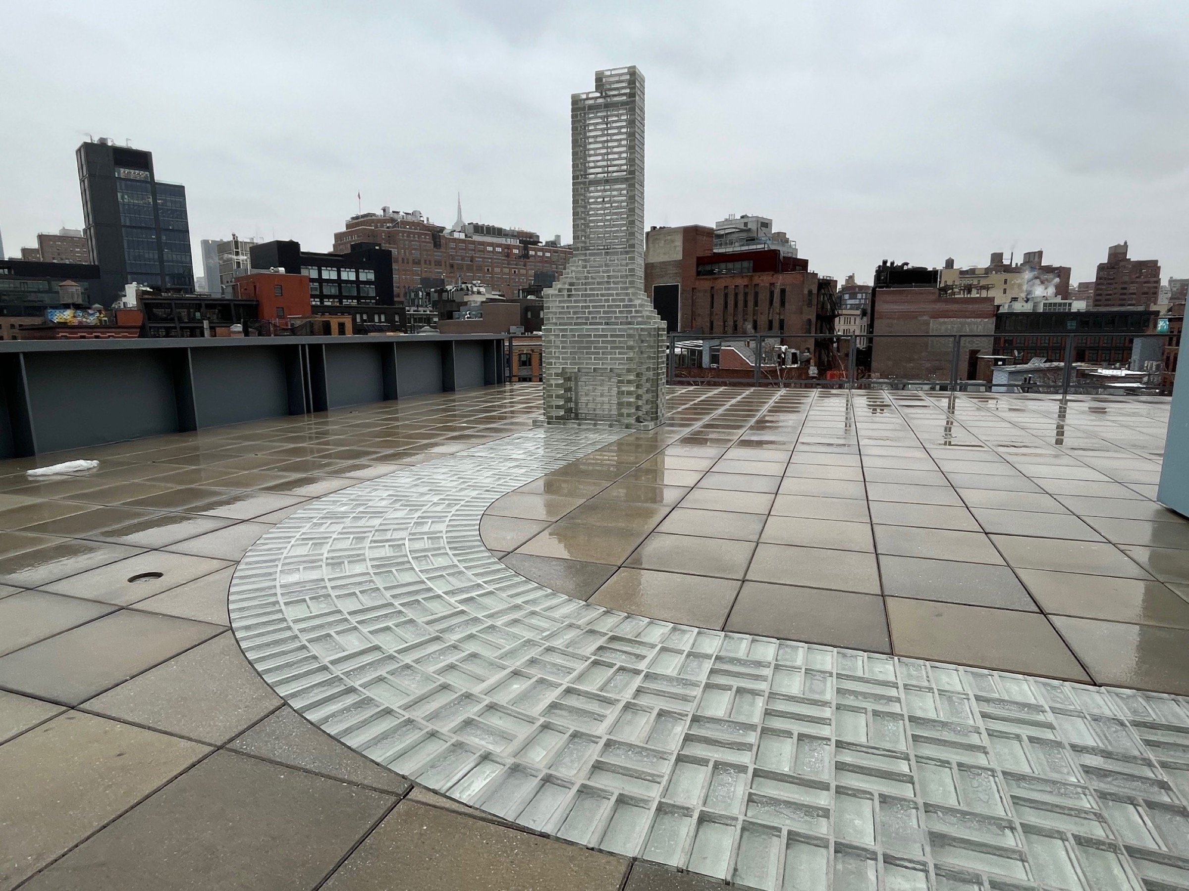 Her most impressive work here is the “Monument,” which stands as a testament to the widespread losses suffered in Altadena, California, in the Eaton Fire in January 2025. After Kelly Akashi’s home and studio burned, the chimney was the only structure left standing. She worked with a mason to rebuild it piece by piece, alongside a reconstruction of her home’s walkway, in luminous glass brick.