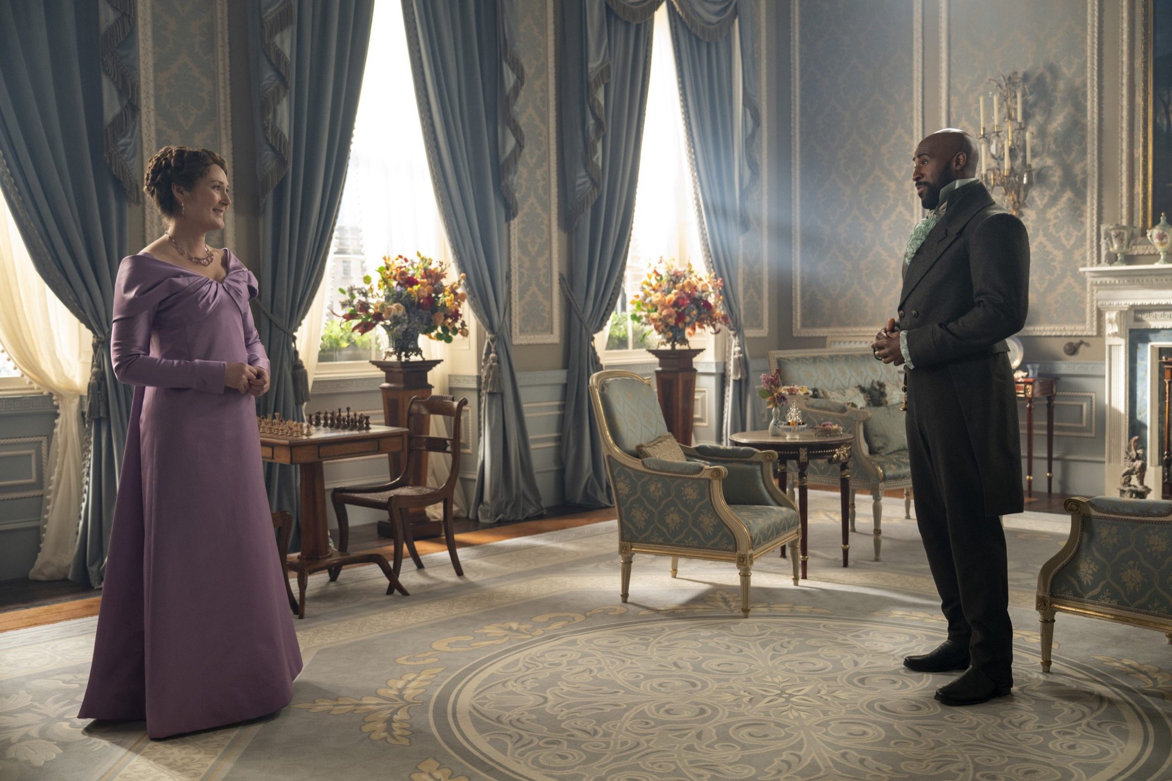 Bridgerton. (L to R) Daniel Francis as Lord Anderson, Ruth Gemmell as Lady Violet Bridgerton in episode 408 of Bridgerton. Cr. Liam Daniel/Netflix © 2025