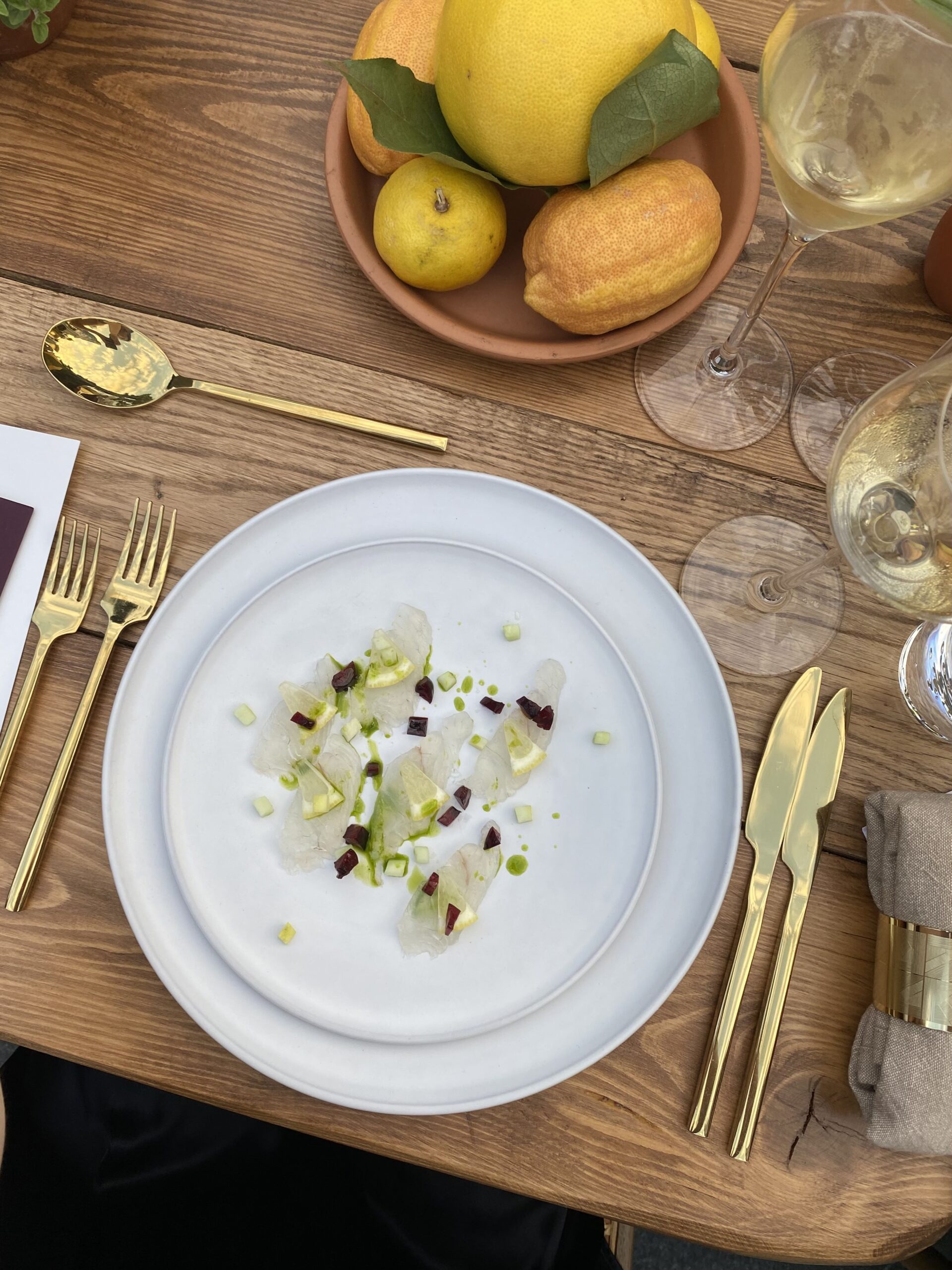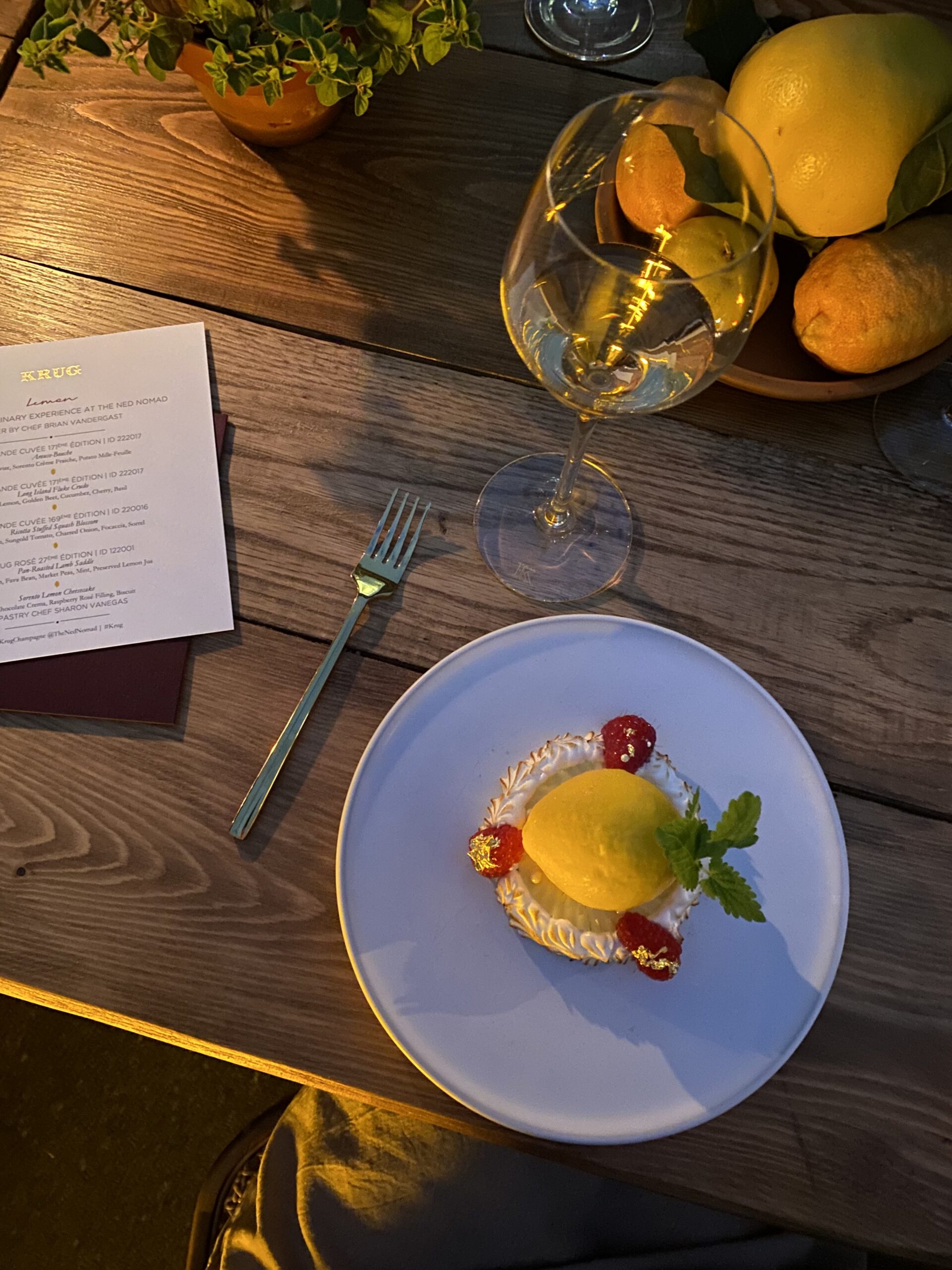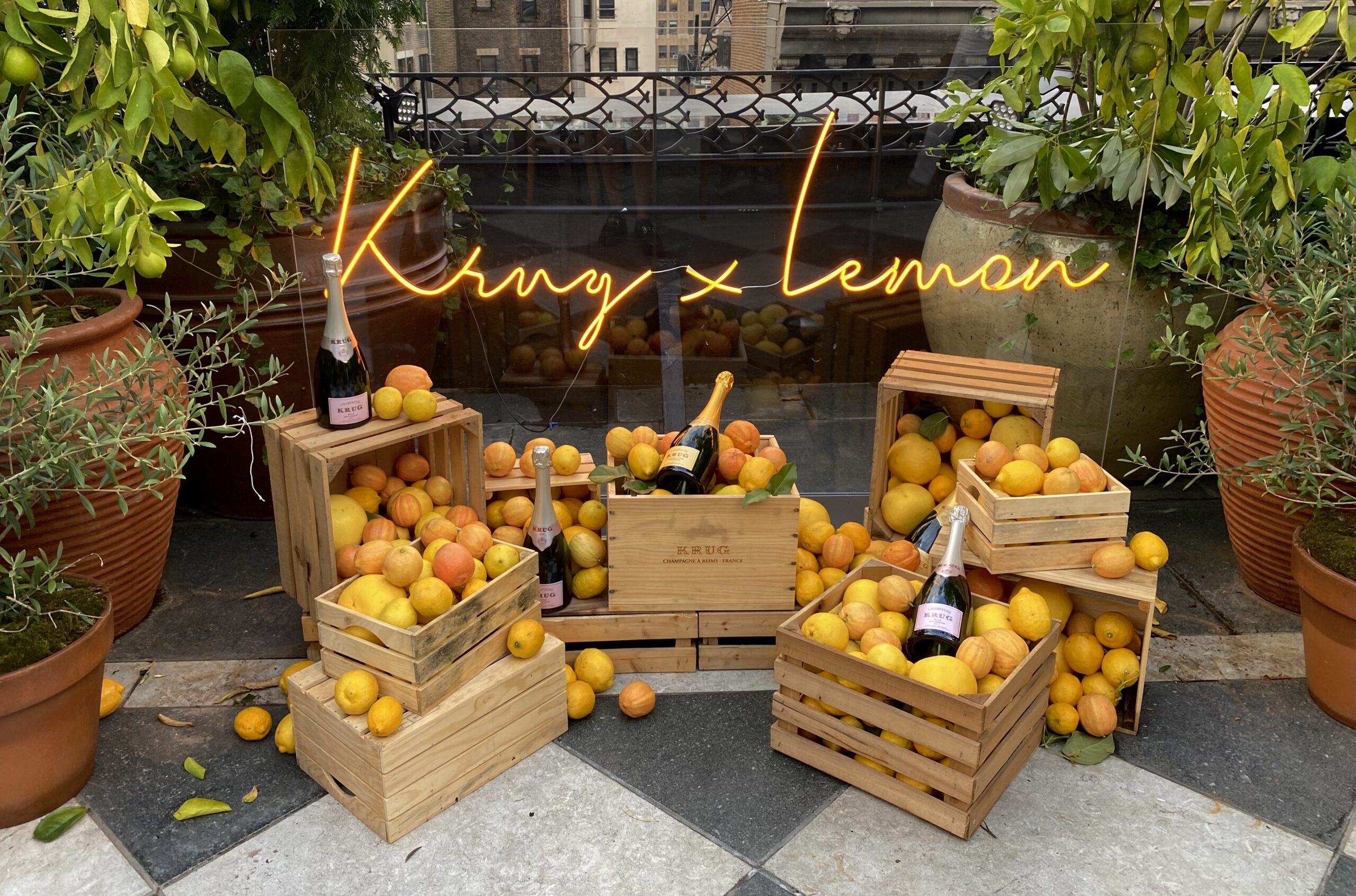 Upon entering the beaux-arts hotel foyer, personnel escorted guests up to a private, secluded area past the Ned-members-only rooftop seating area. The display was almost reminiscent of Italy, as if a slice of the Amalfi Coast had been imported into New York. To the left, guests could find a neon golden yellow sign with “Krug x Lemon” written in cursive. Below the sign were wooden crates stacked on top of each other, overflowing with lemons and other members of the citrus family to give the illusion of a plentiful farmer’s fall harvest. Bottles of Krug Grande Cruvée and Krug Rosé also rested leisurely on top of the fruits — and behind this, guests could take in sweeping views of the Empire State Building. In the center, guests settled into an elaborately decorated, intimate 14-person table, resplendent with plates of citruses and menus tucked away in square, lemon-themed holders. As they arrived, wait staff greeted them with flutes of Grande Cuvée 171ème alongside a caviar, lemon crème fraiche, and potato mille-feuille amuse-bouche.