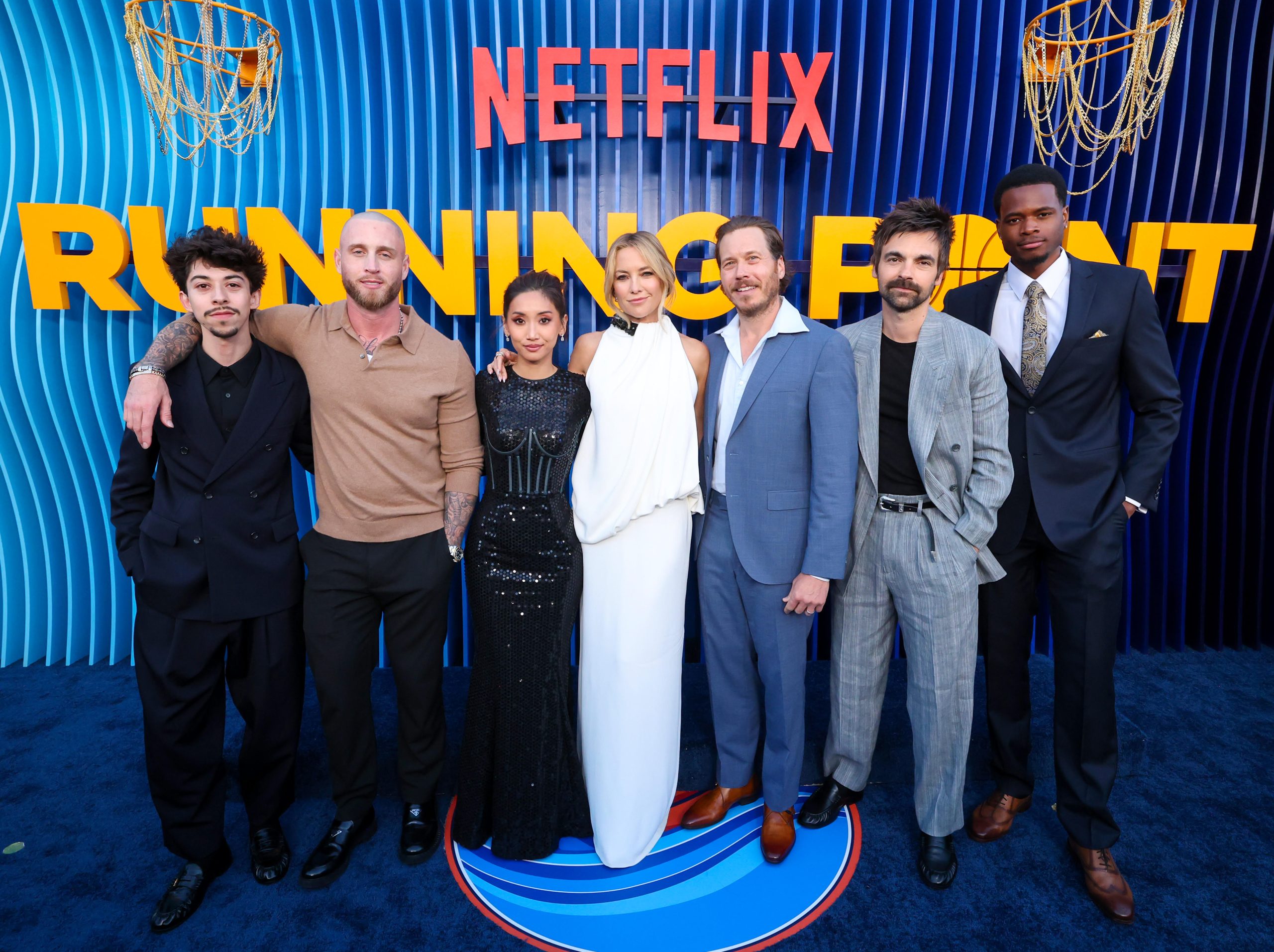 LOS ANGELES, CALIFORNIA – APRIL 15: (L-R) Fabrizio Guido, Chet Hanks, Brenda Song, Kate Hudson, Scott MacArthur, Drew Tarver and Uche Agada attend Netflix’s “Running Point” season 2 LA premiere at The Egyptian Theatre Hollywood on April 15, 2026 in Los Angeles, California. (Photo by Phillip Faraone/Getty Images for Netflix)