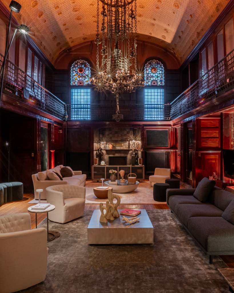 The lounge responds directly to the architecture of the Armory’s Veterans Room, originally realized under the artistic direction of Louis C. Tiffany. Instead of competing with the room’s historic presence, frenchCALIFORNIA works in dialogue with it. Modern silhouettes and restrained palettes sit comfortably against the building’s ornate bones, creating a quiet tension between past and present. Seating arrangements are intentionally relaxed, encouraging conversation without formality and reinforcing the salon’s role as a place for exchange rather than display.