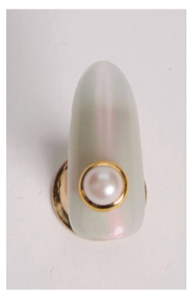 3.    Attach pearl charm with the thick, user-friendly glue that comes in the press on pack. It has a thicker consistency, so when you squeeze the tube, a little bead of glue will form and you can dab that right on the nail.