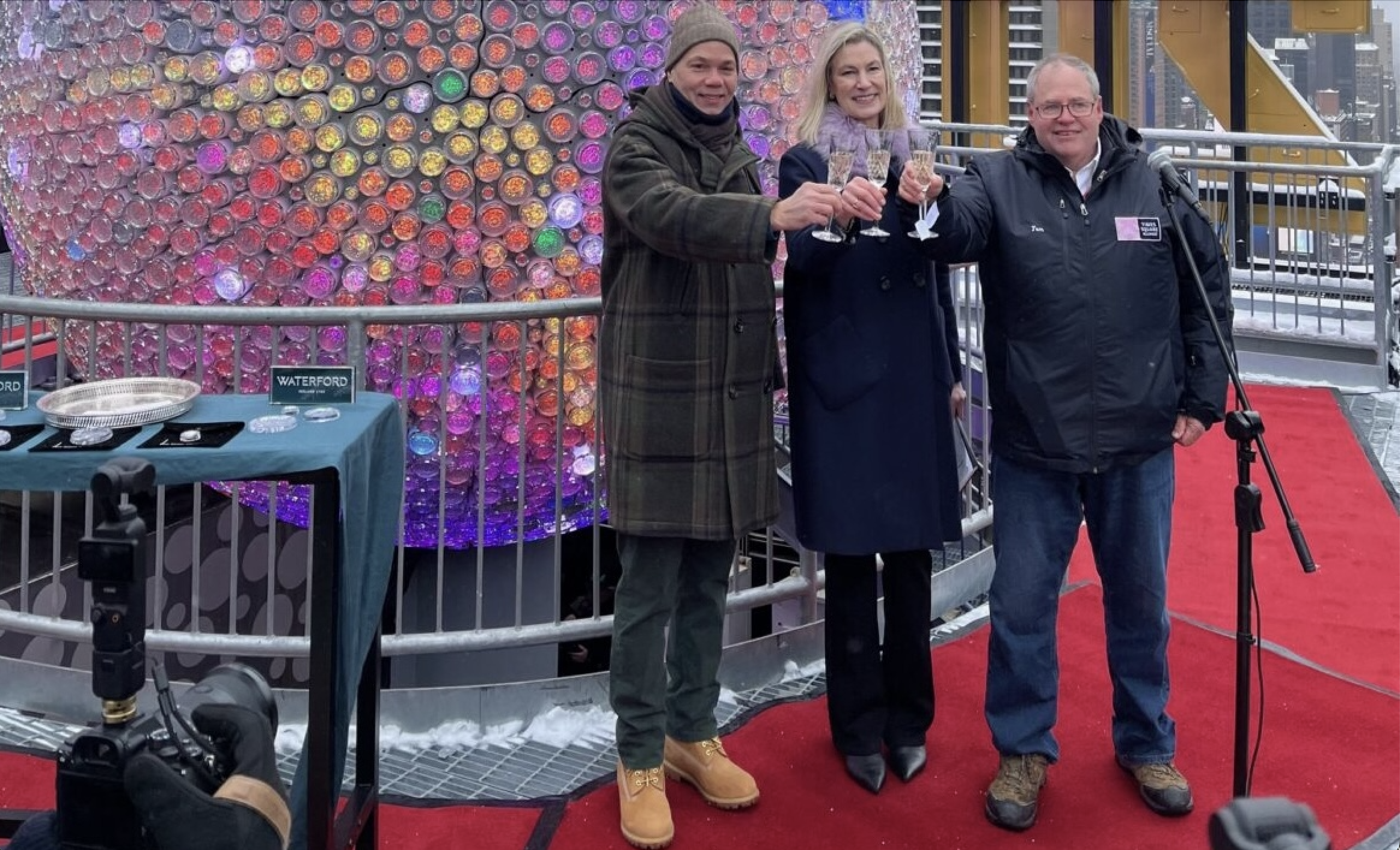 Officials toasting in the udpated design were Michael Phillips, President, Jamestown, the owner and operator of One Times Square, Sherri White, Executive, Jamestown and One Times Square, Co-Organizer of New Year’s Eve, Tom Harris, President, Times Square Alliance, Co-Organizer of New Year’s Eve, and Bentley Hardwick, Global Head of Waterford.