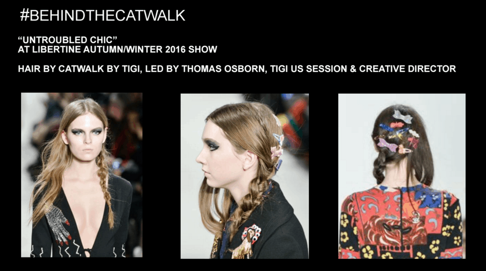 Taking on this styling endeavor was once again Thomas Osborn; who, season after season, brings Hartig’s eclectic look together with impeccably done hair. For the guys, Osborn decided to leave them as is, letting their personalities show though with their own personal hair styles. With the ladies, multiple braids off to the side were used to provide texture for an “untroubled chic” look, embodying the Libertine girl- “casual and cool”. One of the most interesting details Osborn adds, is the burettes in the back. “Johnston went on Amazon for $600 worth of burettes and he didn’t even know if he wanted to use them or not, but more is more here if you will”!