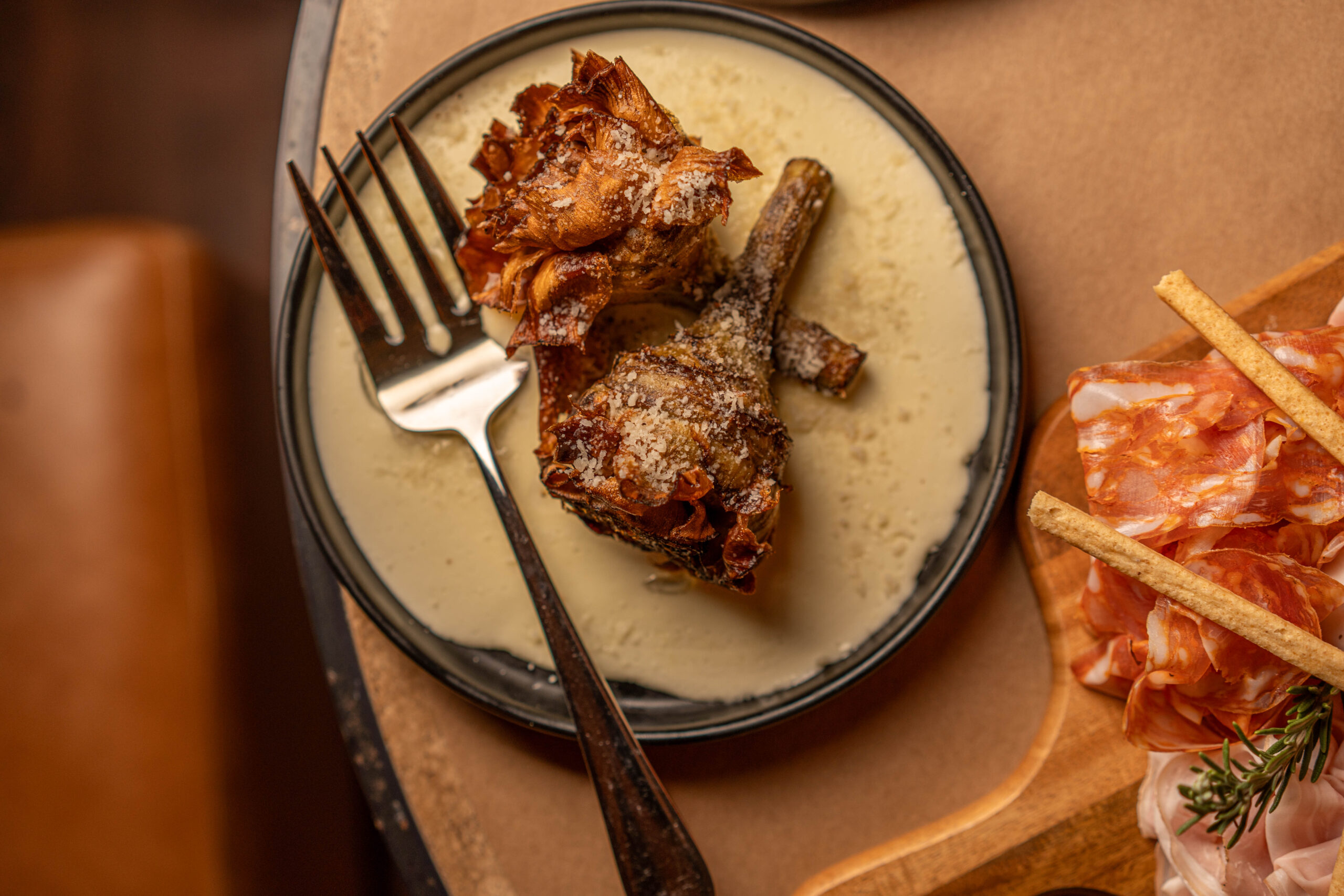 A couple glasses of their Lambrusco to started our night – Salumeria Rosi features the “Pruno Nero” from Cleto Chiarli, which is effervescent, biting, and chilled to wintry perfection. We ordered their Carciofi Fritti, crispy artichoke hearts atop a cacio e pepe cream, as our first appetizer. The decadent sauce at the bottom paired so well with the warm, frizzled vegetable, and we knew the evening’s meal was going to more than deliver. The next appetizer we tried was the Crochette di Prosciutto, which is a bechamel croquette stuffed with prosciutto di parma. It’s exclusive to the East Village location, and let me just say if you’re a fan from the Upper West Side wondering if you need to make the trek, I can give you one very good reason. Perfectly crispy at the surface with a filling like a cacio e pepe flavor bomb, gooey and flavorful, it feels like it can’t get any better until you realize halfway through the bite that cubes of prosciutto in the mix are what’s bringing in that smoky, salty, peppery essence. The prosciutto in this dish resembles what most of us would think of as guanciale: it’s cubed, dense, and chewy in all the right ways.