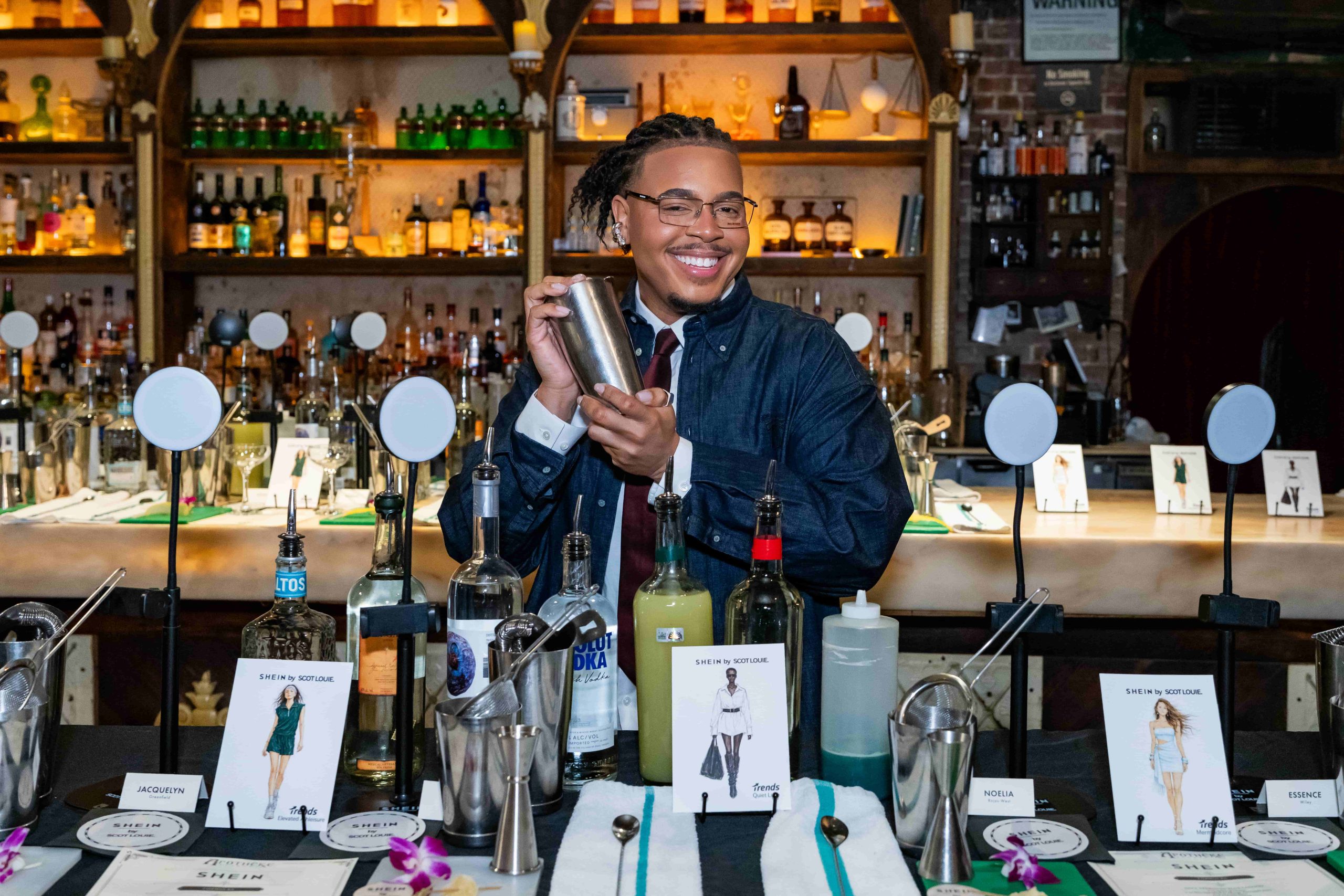 Close-up of cocktail-making station, and ‘Elevated Athleisure’ look by Scot Louie | Courtesy of SHEIN