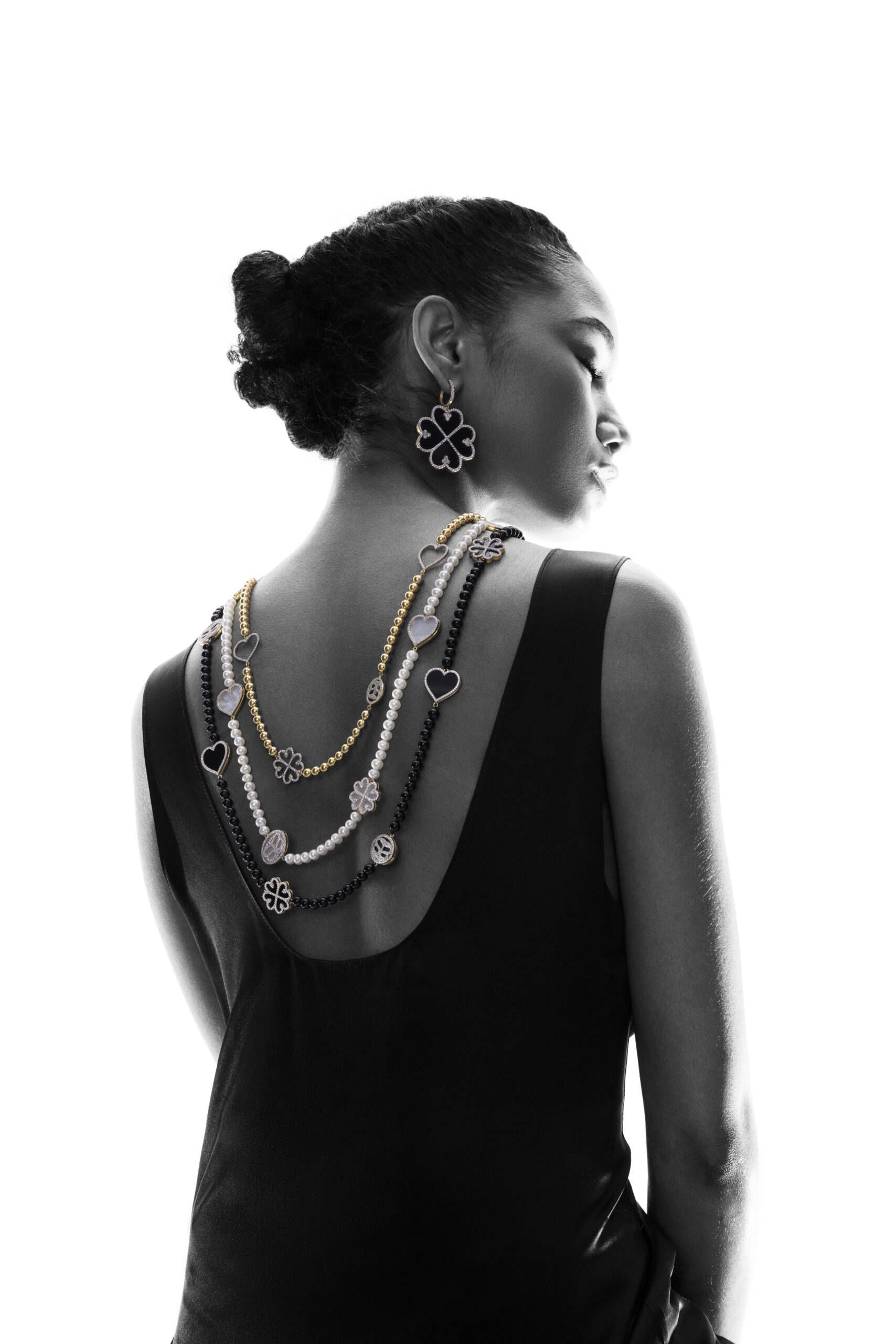 Each jewelry piece is crafted in 18K yellow gold over sterling silver and adorned with brilliant simulated diamonds. Select styles feature carved mother-of-pearl or onyx inlays, alongside cultured freshwater pearls. From statement necklaces to sculptural earrings, the collection balances strength and refinement through elevated craftsmanship and modern form. For Simone, the symbolism is the soul of the collection. “What’s really great about it is that all of the pieces are African tribal symbols,” she explains, representing Abundance, God’s Child, God’s Protection, Greatness, and Patience. Drawing direct inspiration from the Akan tribe of Ghana, the Adinkra symbols carry layered meanings that are both deeply rooted and universally resonant, designed to be worn, felt, and interpreted by everyone.