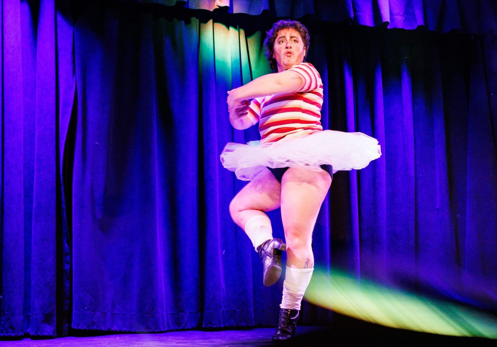 Next, Pirowet, played by Kat Gallo, who was sporting a striped button down shirt paired with a tutu, took stage from the audience, nervously settling into place. Once the number began, it became clear that the nervous expression was part of the performance. Gallo began with a series of leaps across the stage and ended full on voguing by the end. The high intensity song “Electric” accompanied Gallo’s hyper pop, audience interactive performance.
