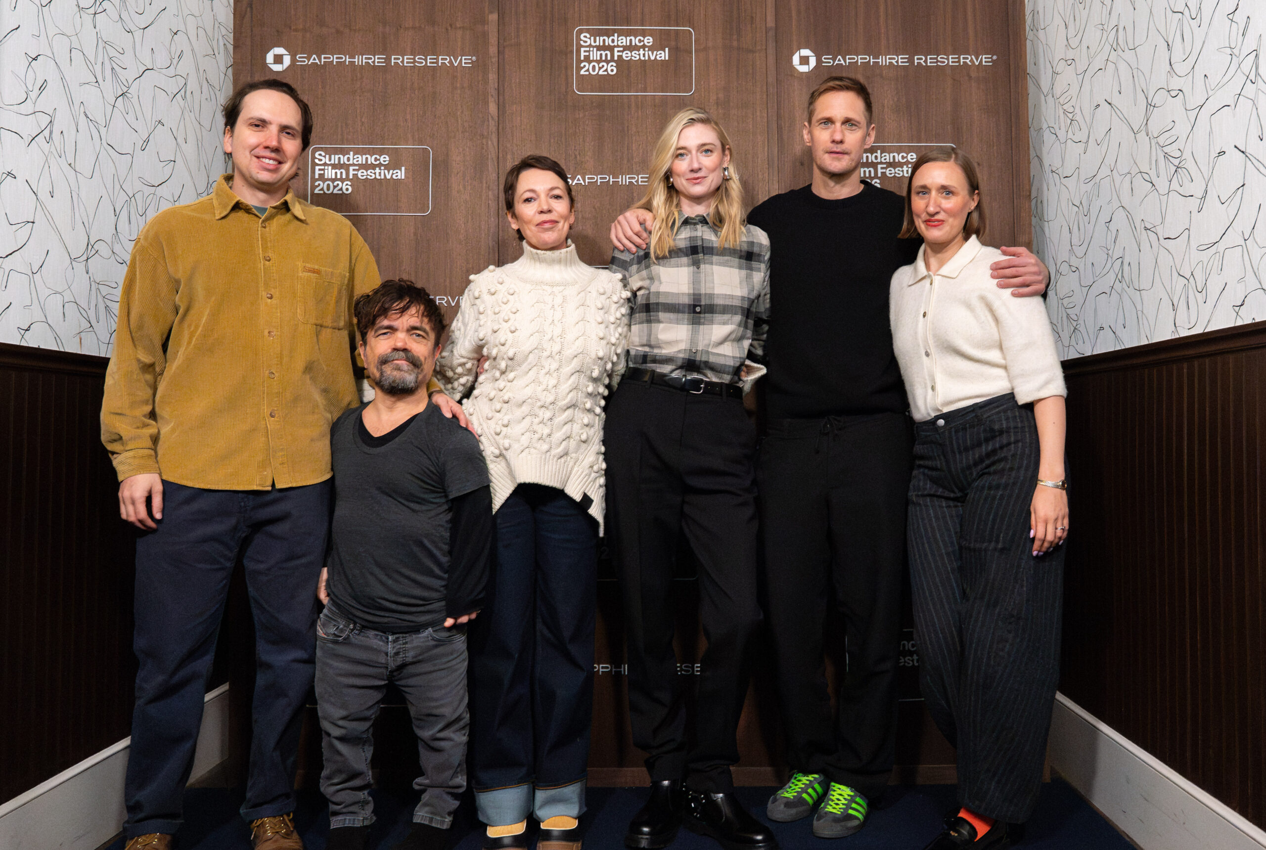 Director Alex Huston Fischer, actors, Peter Dinklage, Olivia Colman, Elizabeth Debicki, Alexander Skarsgrd and director Eleanor Wilson before speaking on the ÒWickerÓ panel at L.A. Times Talks, presented by Chase Sapphire Reserve during Sundance Film Festival, on Friday, Jan. 23, 2026, in Park City, Utah (Courtesy Joshua Lawton for Chase)