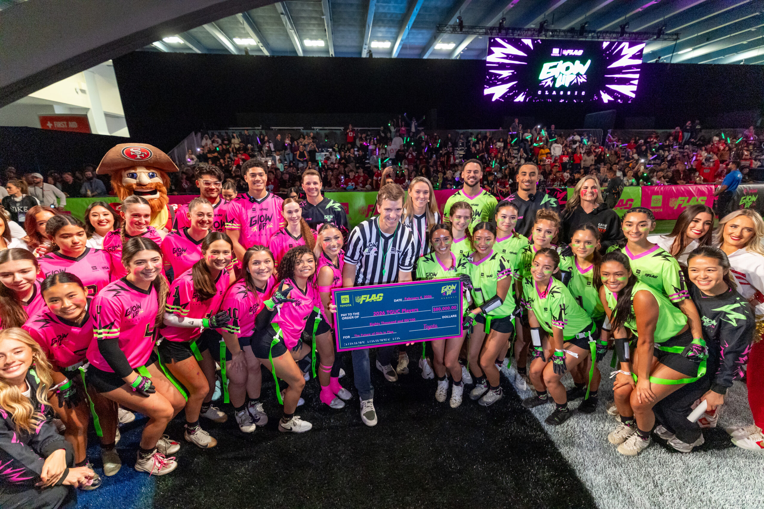 NFL legend Eli Manning and Kylie Kelce served as celebrity referees during the Toyota Glow-Up Classic, a glow-in-the-dark flag football exhibition featuring female Bay Area youth players and NFL stars, held at the Super Bowl Experience on Feb. 4.