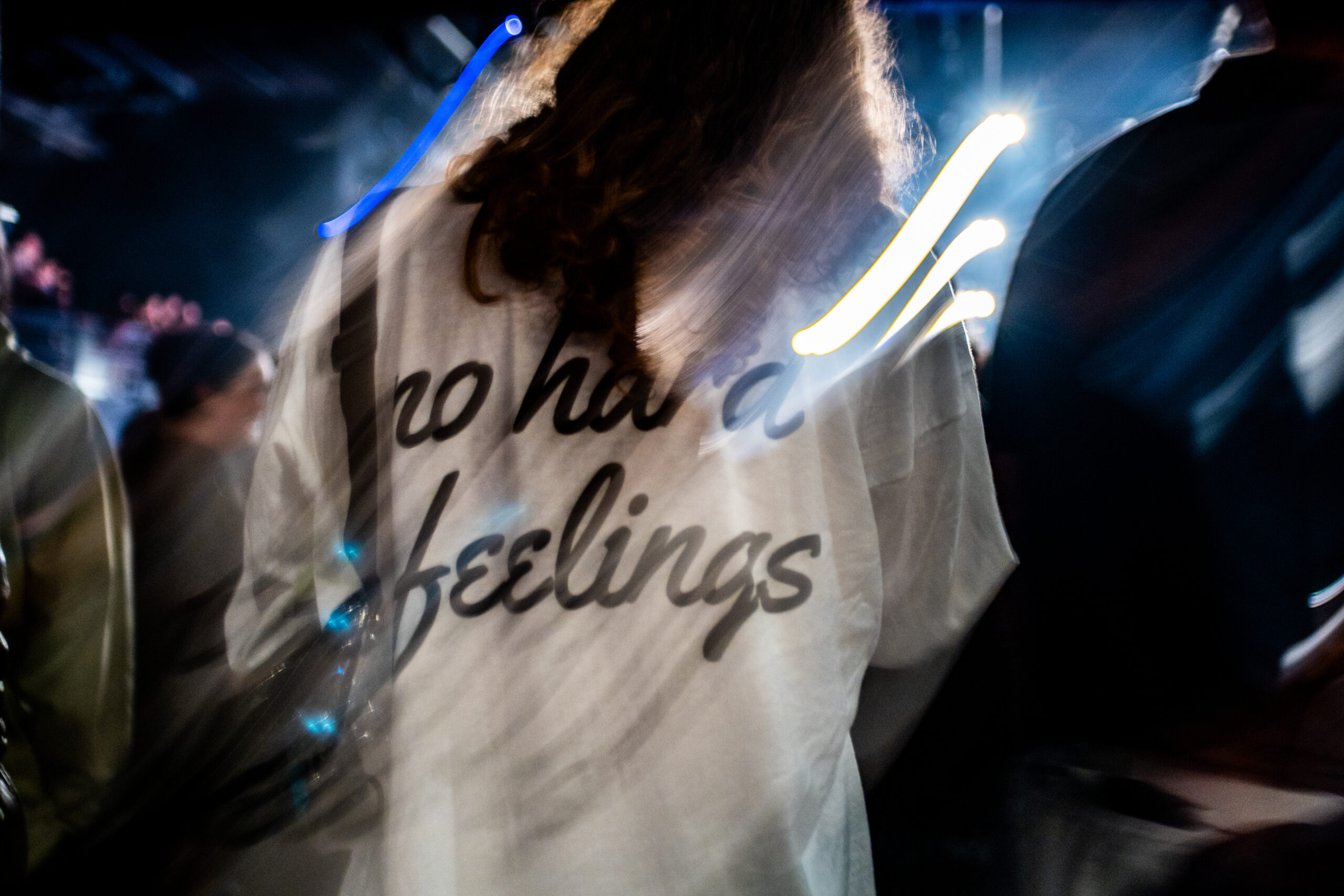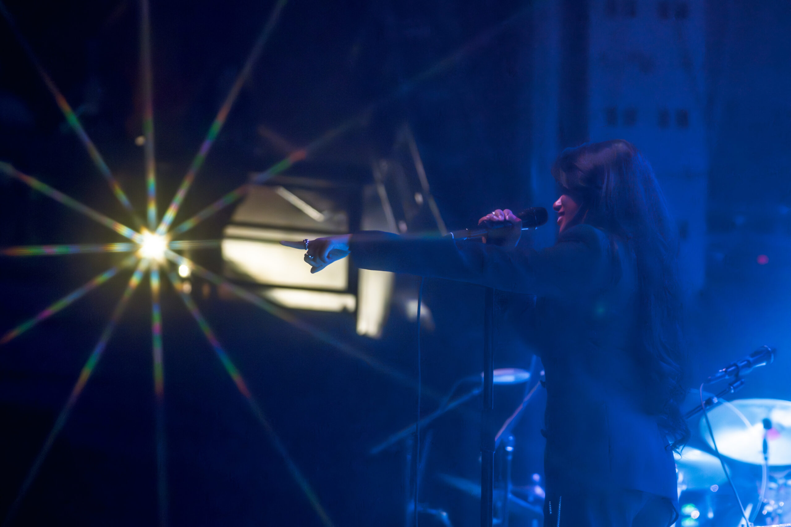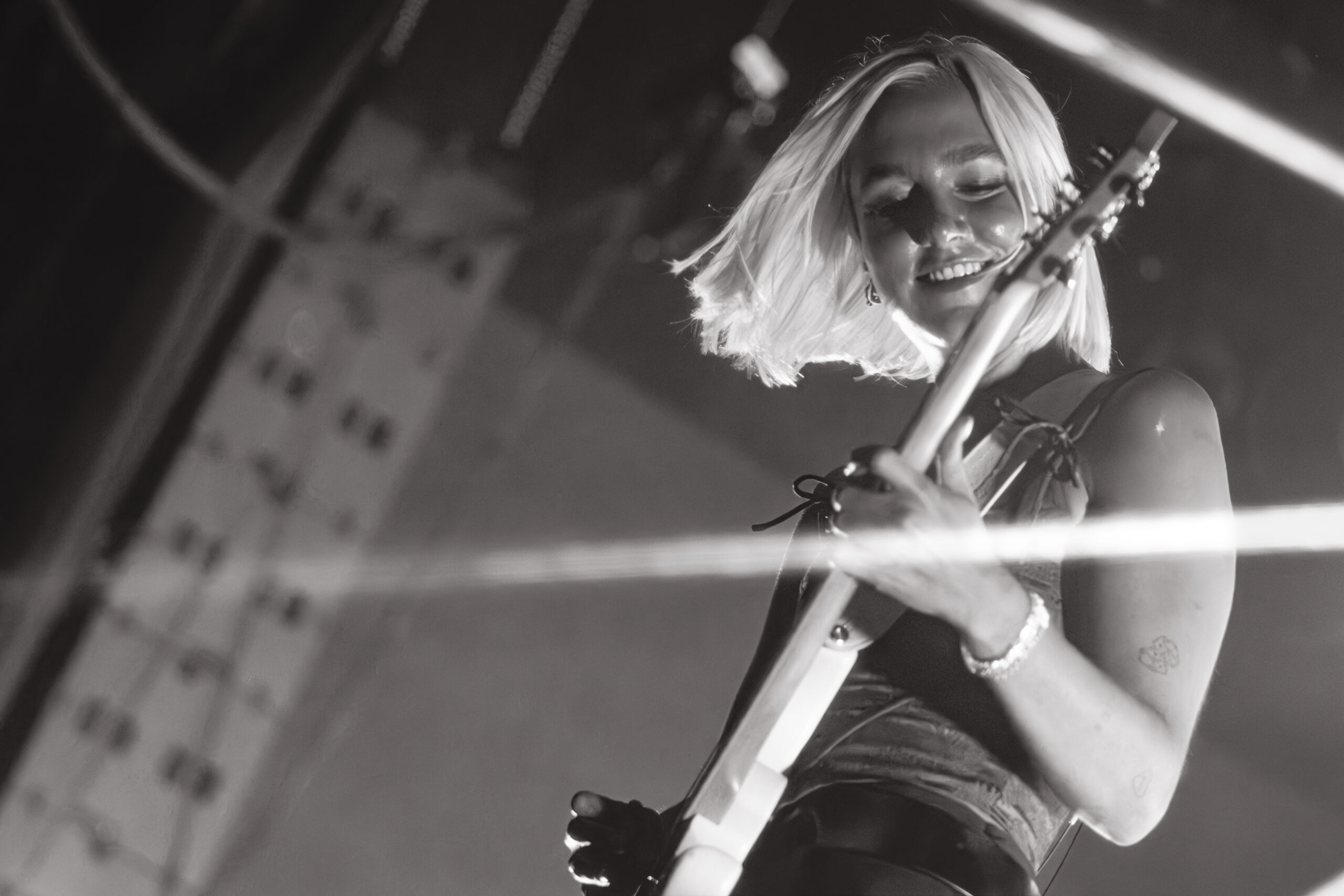 The “Very Best of Girl Rock” spins on Spotify as I build my kit to Muna. I am the first girl at the party. I tested my camera and the lens on a jazz ball to kick off a journey through shine and sparkles (not just what’s powering Carlos Sainz), including Debbii Dawson’s glittering water bottle. And while that surface proved reflective, it was the only thing illuminated outside of Dawson’s keytar. Photographers in the pit looked at each other, bewildered at the darkness, and confirmed through shrugs what they were seeing: nothing at all. Being outside of the light, a great photo does not make. A shifted ISO to make the focus work, and we all crossed our fingers. A blind journey that was indeed rewarded if you got crafty.