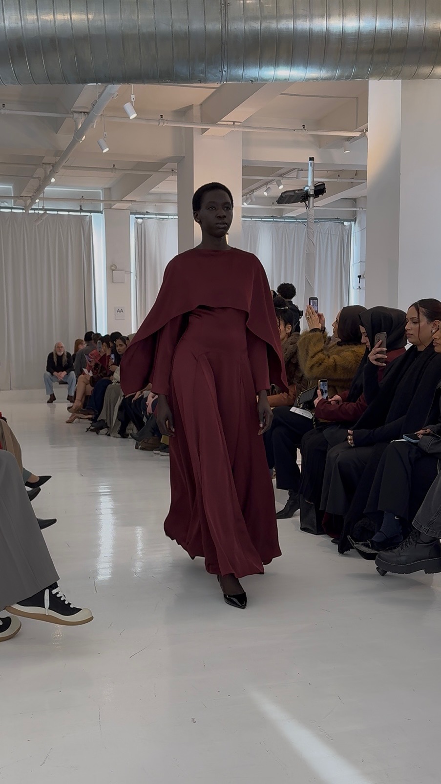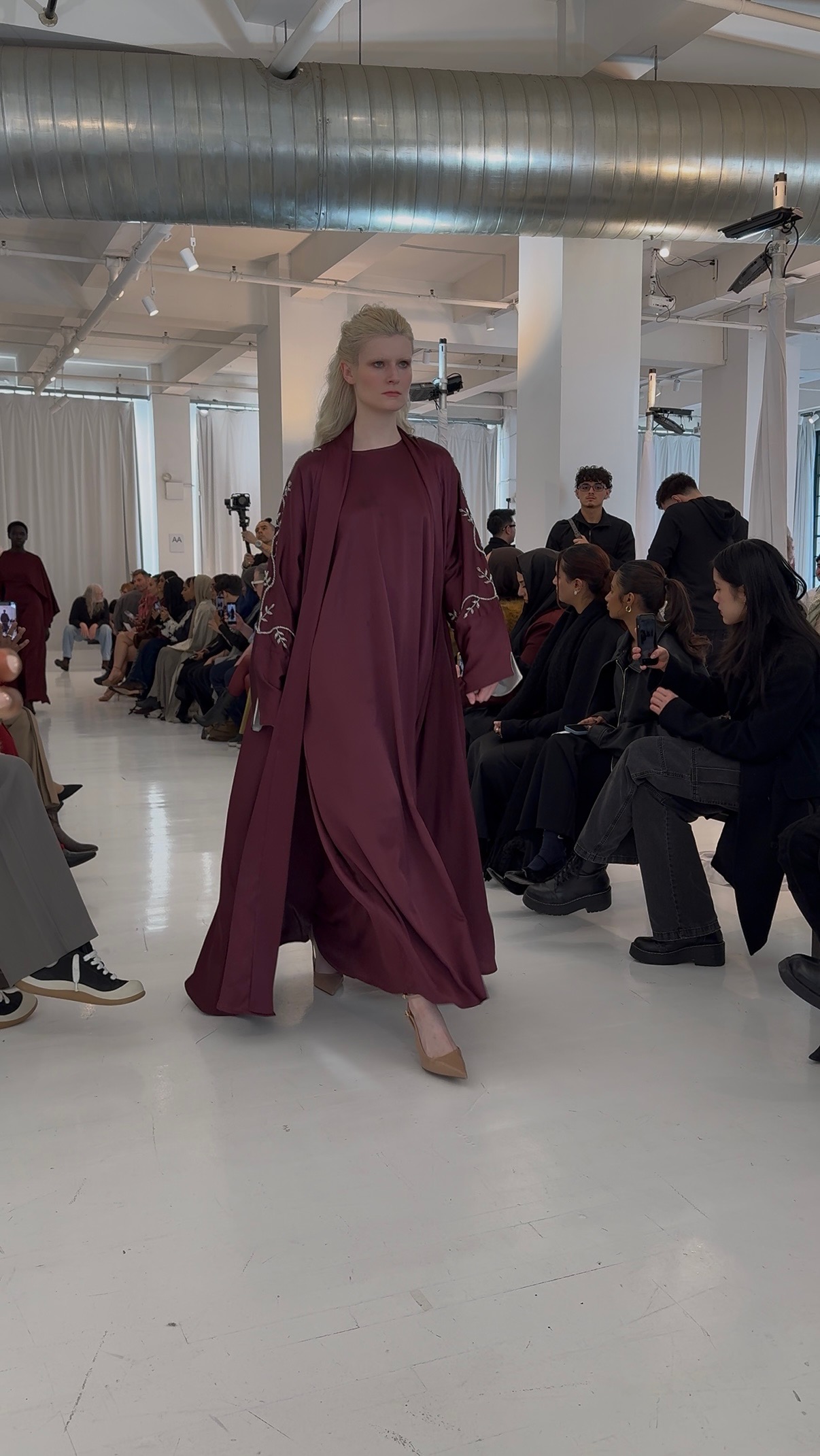 At NYFW Fall/Winter 2026, the collaboration between Modest Now and Muslimi delivered a striking vision of contemporary fashion defined by renewal, edge, and cultural depth. The collection’s color palette was mesmerizing, seamlessly moving through rich seasonal tones, with a particular emphasis on maroon hues that felt both captivating and modern. The dresses designed by Maryam Amaria flowed with effortless elegance. Their graceful tailoring and soft movement gave each model an almost mythic or goddess-like presence on the runway.