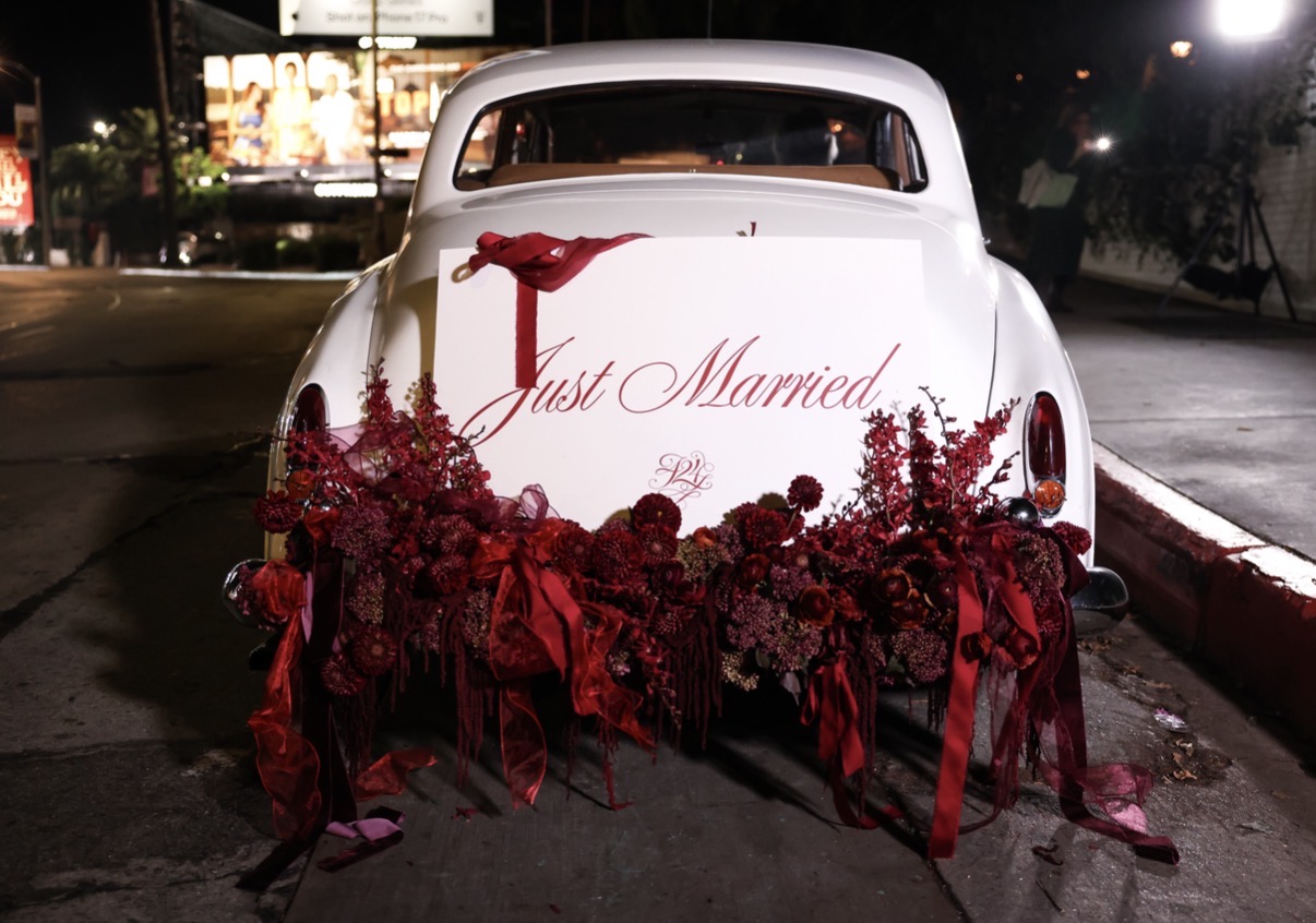 The celebration continued at the iconic Chateau Marmont, where the after party transformed into a surreal, wedding-inspired dreamscape that echoed the film’s themes of love and illusion. Upon entry, guests were greeted by a towering champagne display and an intricately designed wedding cake, immediately setting a romantic yet slightly tongue-in-cheek tone. Signature cocktails including “Cupid’s Kiss,” “The Confession,” and “Till Death Do Us Part” kept the theme alive, while two elaborately decorated hotel suites invited guests to step into “Bride” and “Groom” fantasy worlds, complete with robes, veils, and perfectly curated photo moments. At the heart of the party, a pool blanketed in rose petals served as a striking visual centerpiece, while outside, a vintage white car adorned with a “Just Married” sign became one of the evening’s most Instagram worthy backdrops. Much like the film itself, the evening was equal parts romance, spectacle, and subversion. An immersive experience that blurred the line between celebration and performance.